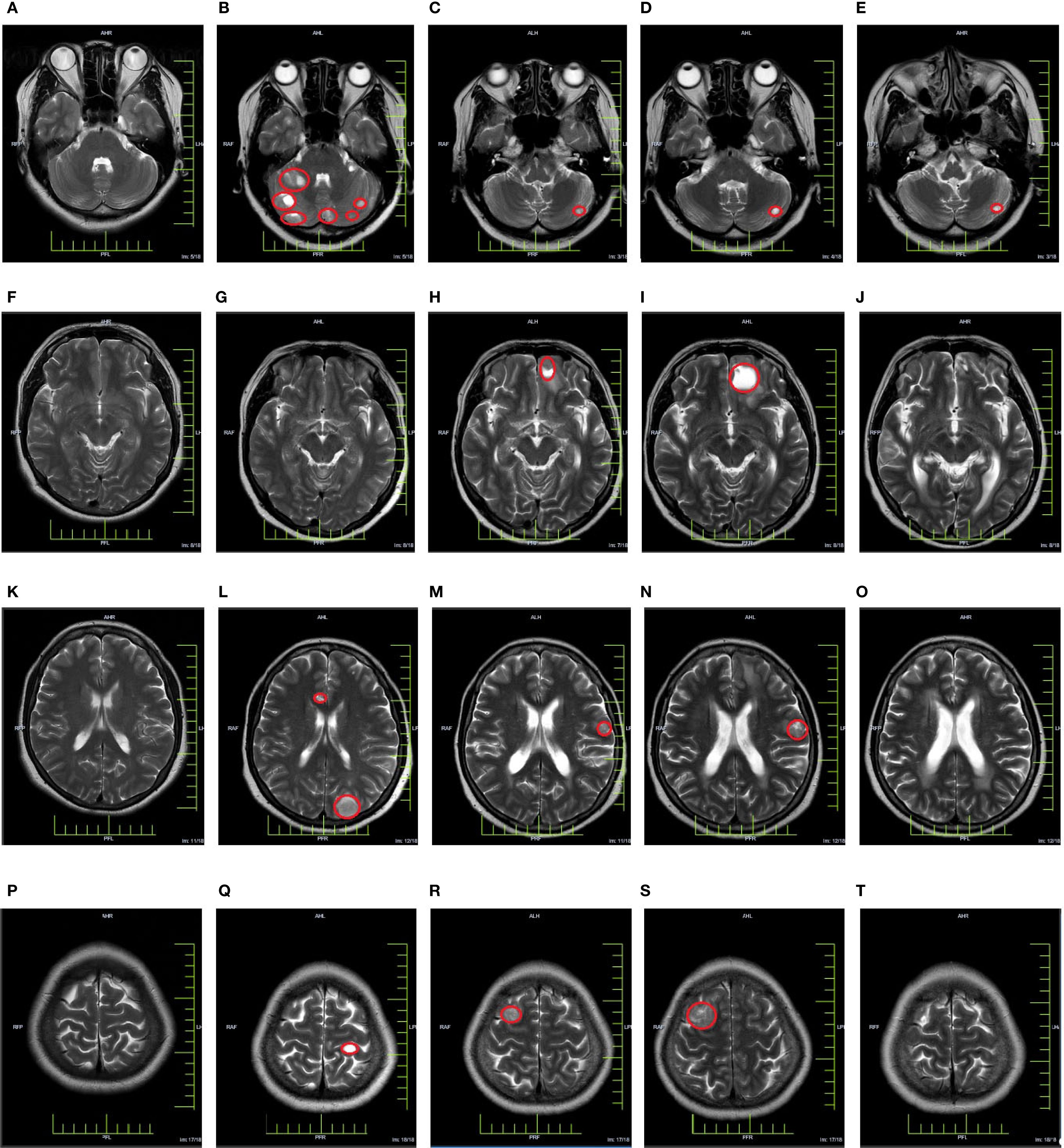 Figure 2. Cranial MRI evaluation map [(A, F, K, P) In March 2021, a baseline cranial MRI evaluation was performed, revealing no apparent abnormalities in the cranium. (B, G, L, Q) In March 2022, a follow-up cranial MRI examination was conducted, revealing the presence of multiple metastatic lesions. (C, H, M, R) In March 2023, a follow-up cranial MRI examination was conducted, revealing the presence of newly detected lesions in the cranium (D, I, N, S) In October 2023, a follow-up cranial MRI examination was performed, revealing an increasing trend in the size of the lesion. (E, J, O, T) In December 2023, a follow-up cranial MRI examination was conducted, revealing a significant reduction or disappearance of metastatic lesions].