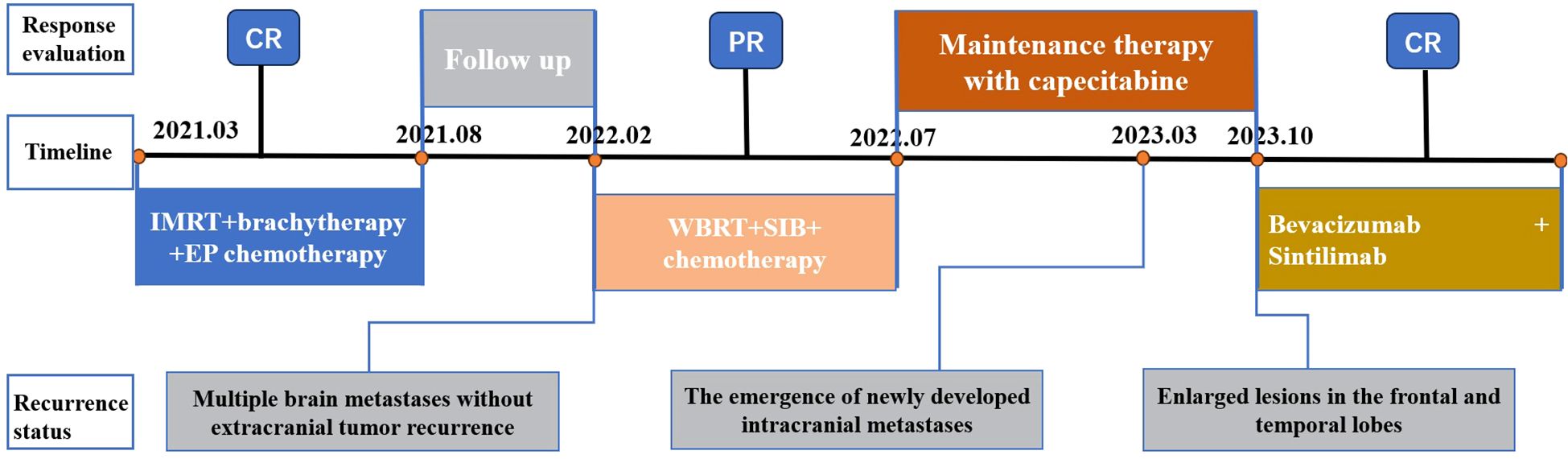 CSCC is an infrequent yet highly aggressive malignancy that was initially documented by Albores-Saavedra et al. in 1972 (11). The diagnostic and therapeutic strategies for CSCC have been primarily drawn from the methodologies employed in addressing SCLC and prevalent cervical tumors. However, due to its inherent predisposition for distant metastasis and rapid relapse even after achieving complete remission, each treatment modality encounters substantial challenges when applied to CSCC patients. Here, we present a case report of a patient diagnosed with stage III C1 CSCC three years ago. Encouragingly, the patient has reached an important survival milestone of 30 months since the occurrence of brain metastasis and is presently in CR stage. The comprehensive treatment course is illustrated in Figure 3. Throughout the entire treatment process, we have identified three key issues worthy of discussion and critical insights for further analysis and experience accumulation.