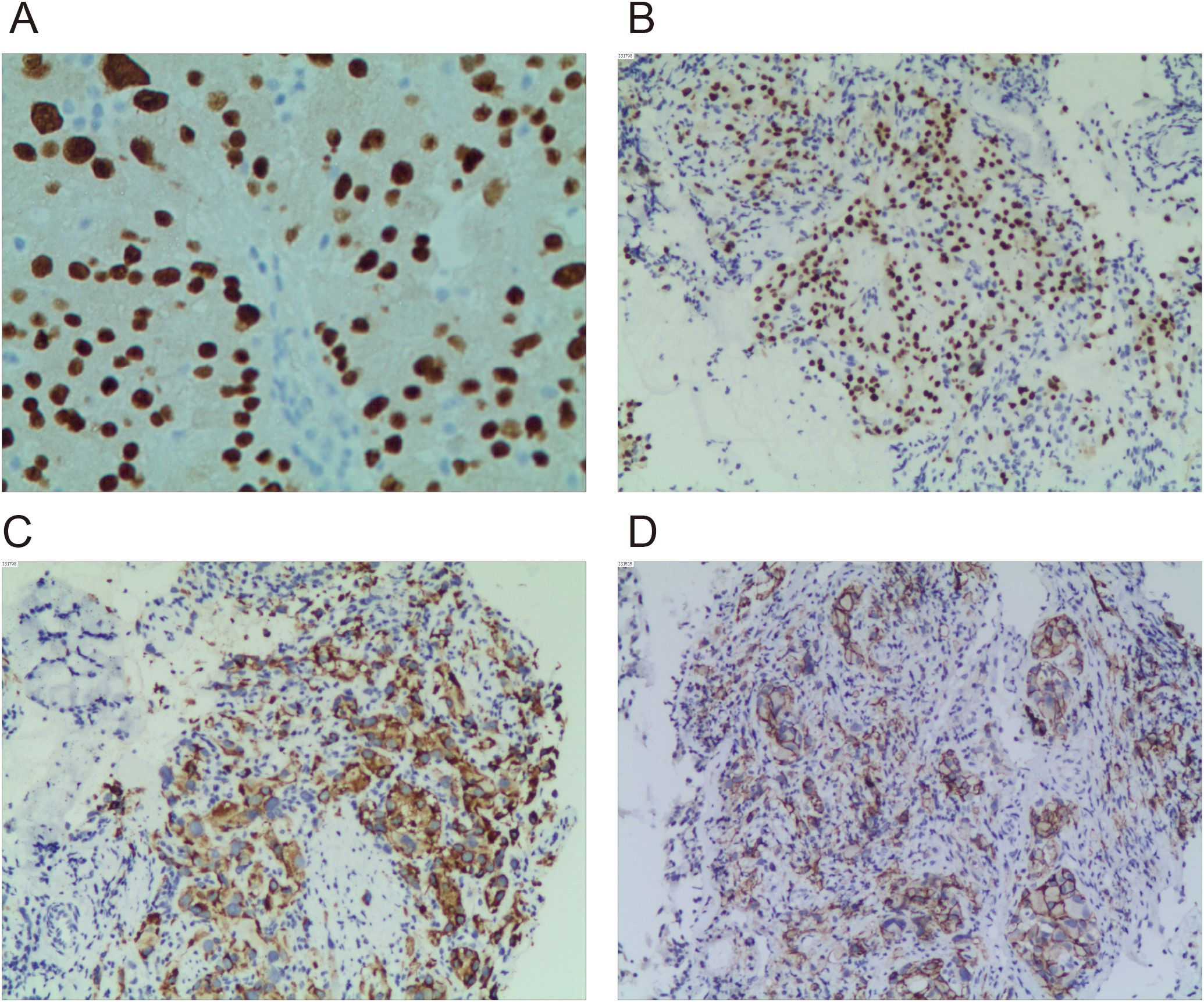 Figure 1. Immunohistochemical staining images of PAX8, P504s, and PD-L1. (A) Immunohistochemical detection of PAX8 in left supraclavicular lymph node specimens (×400). (B) Immunohistochemical detection of PAX8 in left upper lobe specimen (×200). (C) Immunohistochemical detection of P504s in left upper lobe specimen (×200). (D) Immunohistochemical detection of PD-L1 in left upper lobe specimen (×200).