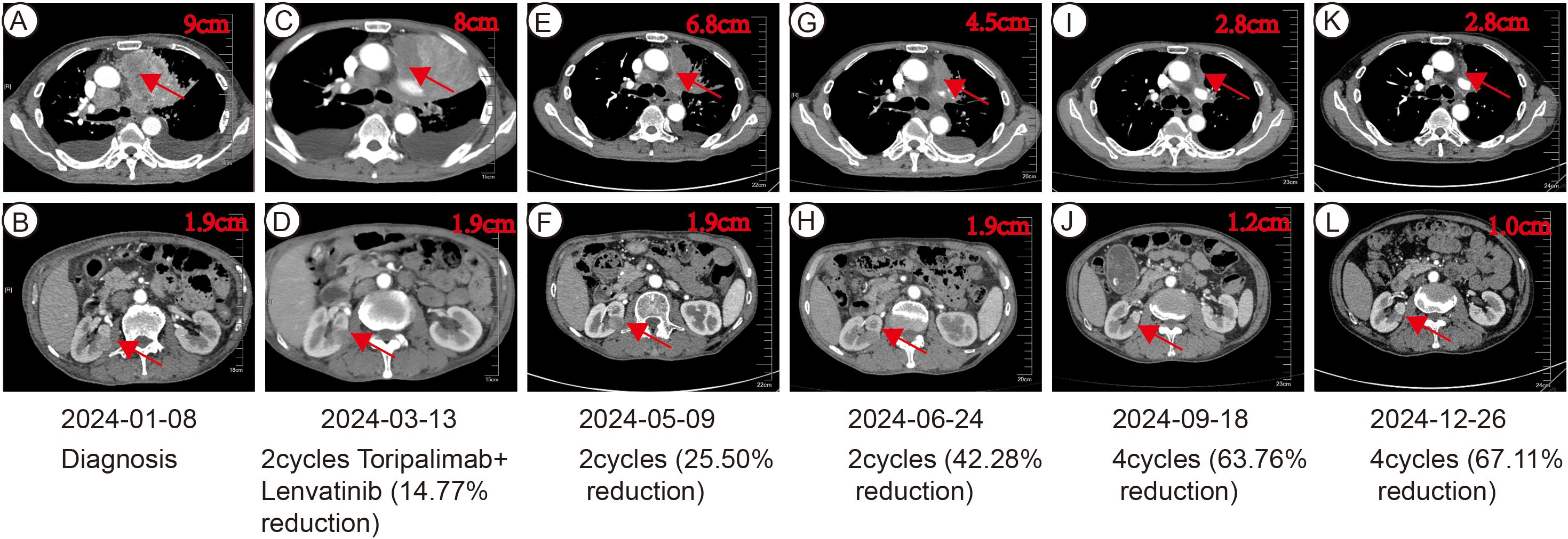 Figure 2. CT imaging assessment of left lung lesion and right kidney mass throughout the course of disease corresponding to their respective time points. (A, B) CT image at initial diagnosis on January 8, 2024. (C, D) CT image on March 13, 2024. (E, F) CT image on May 9, 2024. (G, H) CT image on June 24, 2024. (I, J) CT image on September 18, 2024. (K, L) CT image on December 26, 2024.