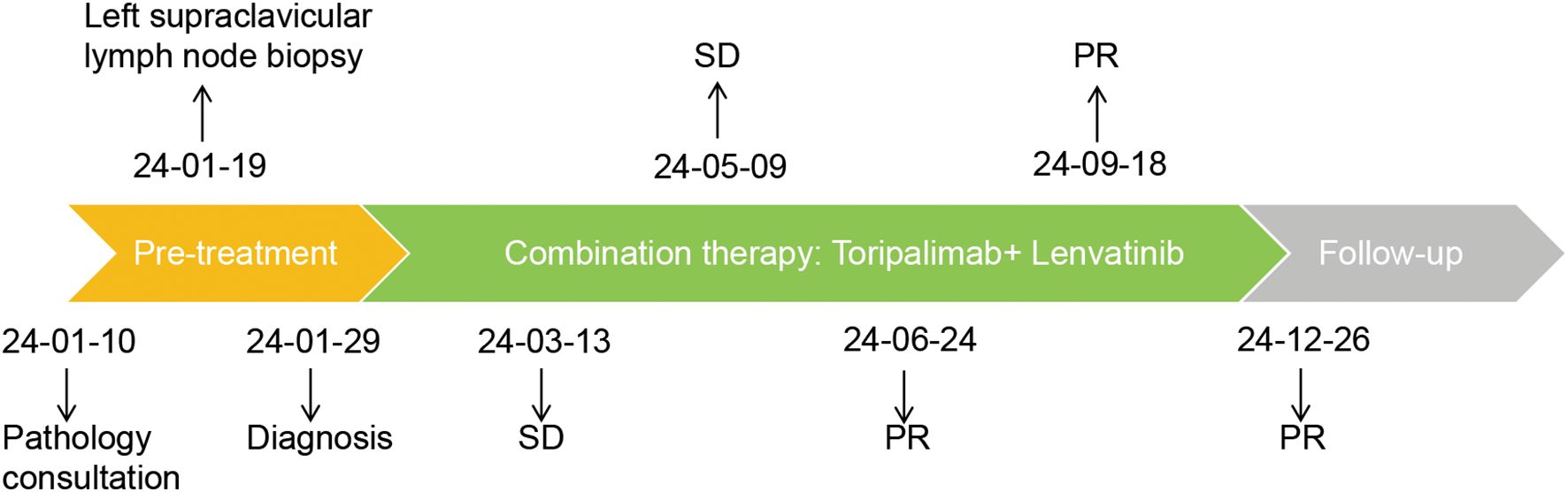 Timeline of a medical treatment process. Pre-treatment phase includes pathology consultation on January 10 and diagnosis on January 29. Combination therapy with Toripalimab and Lenvatinib begins, with SD observed on March 13 and May 9. PR noted on June 24 and September 18. Follow-up phase includes PR on December 26. Lymph node biopsy occurred on January 19.