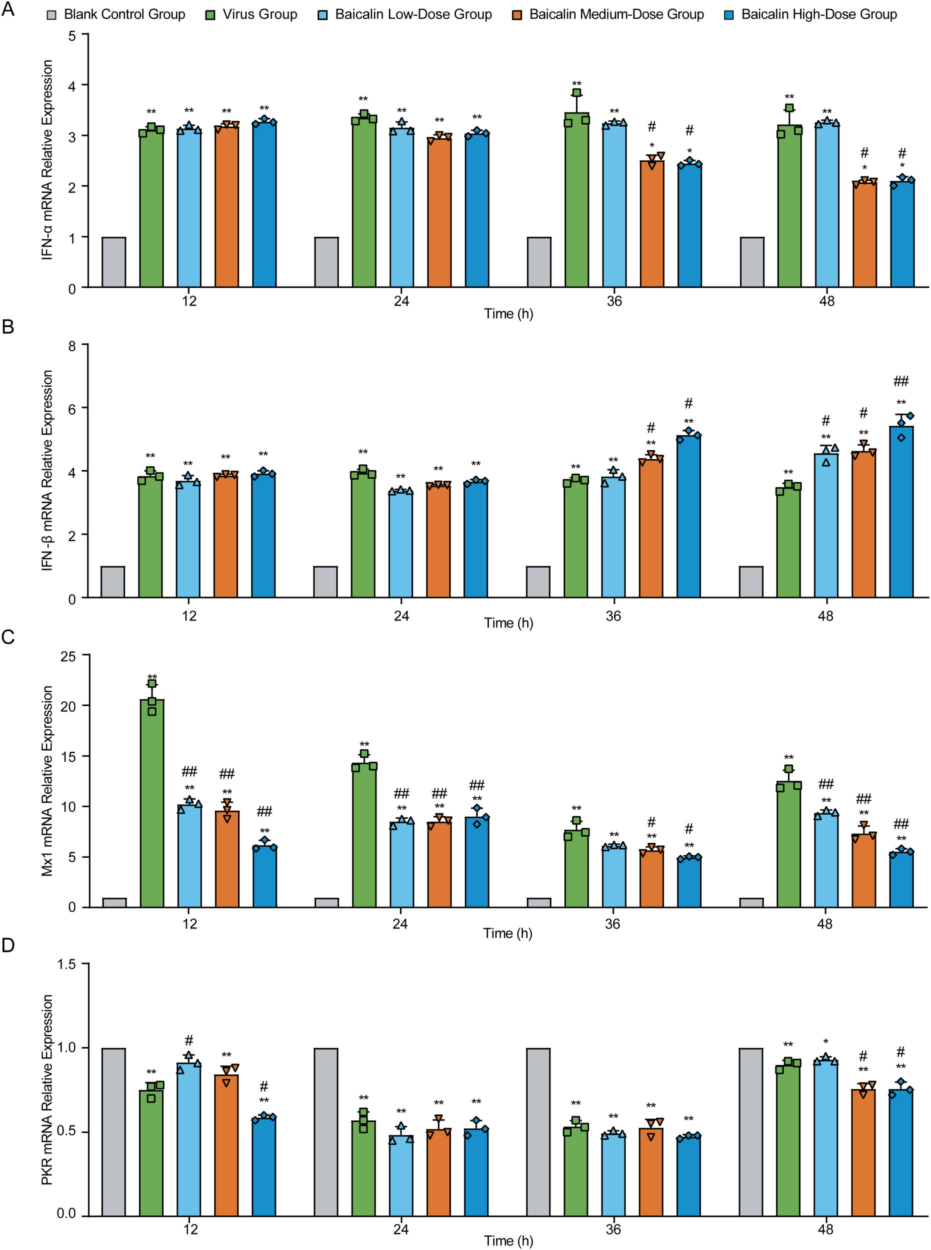 Effect of baicalin treatment on antiviral gene expression in H9N2-infected MLE-12 cells. Relative mRNA expression levels were determined using RT-qPCR at indicated time points (12, 24, 36, and 48 hours post-infection). Genes analyzed include: (A) IFN-α, (B) IFN-β, (C) Mx1, and (D) PKR. Treatment conditions comprised Blank Control Group, Virus-Infected Group, and Baicalin-treated groups (Low-dose: 5 µg/mL; Medium-dose: 10 µg/mL; High-dose: 15 µg/mL). Statistical significance was determined using non-parametric one-way ANOVA. *P < 0.05, P < 0.01 compared with the control group; #P < 0.05, ##P < 0.01 compared with the virus group.