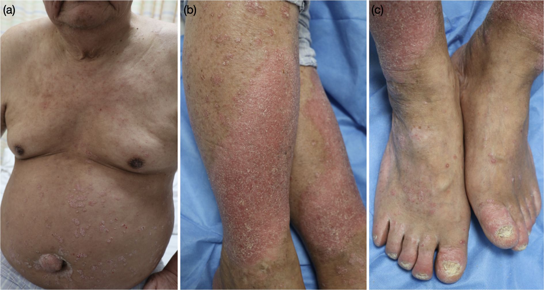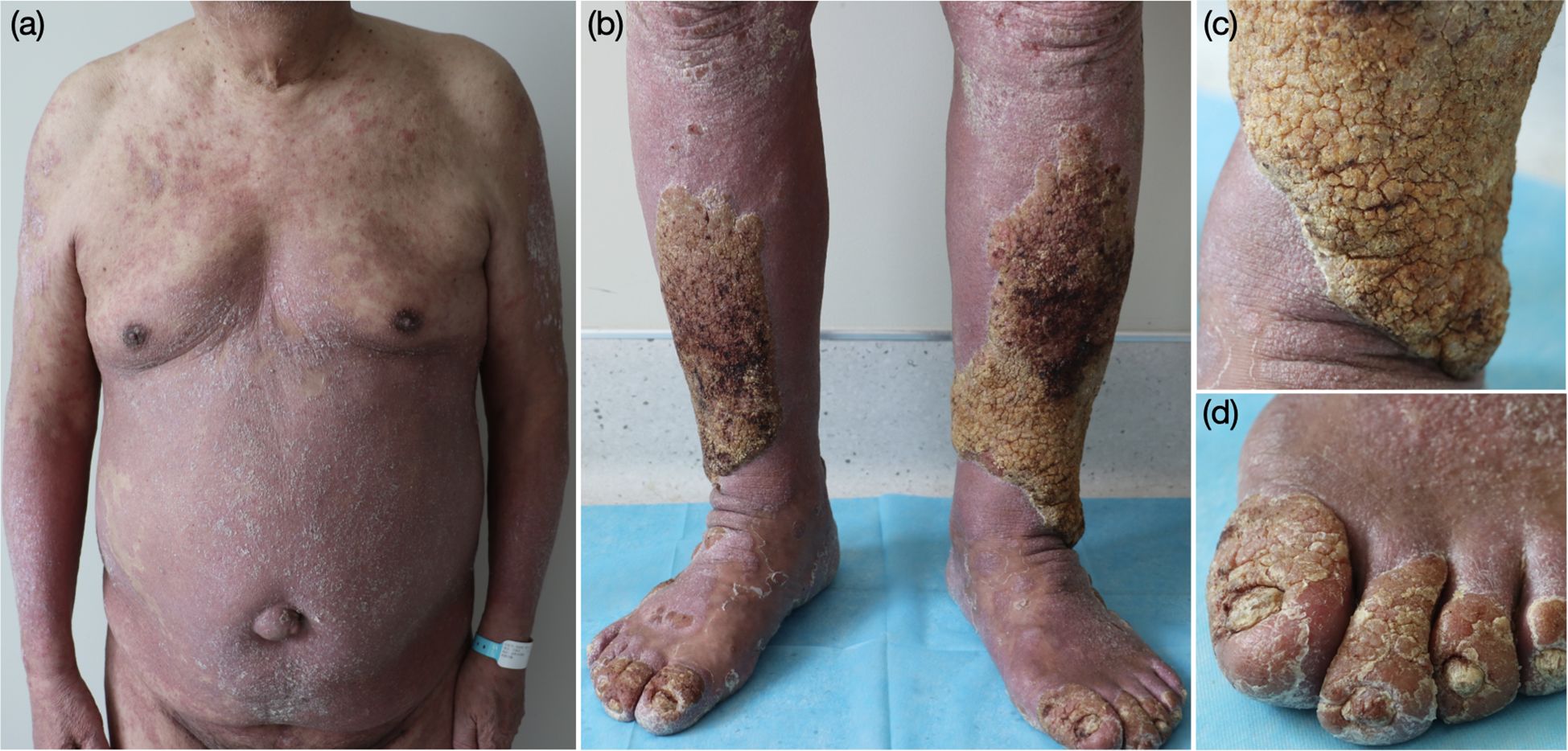 A 77-year-old Chinese male with a 10-year history of plaque psoriasis had recurrent episodes of symmetric hypertrophic verrucous plaques of both lower legs superimposed on pre-existing psoriatic plaques. The patient was monitored for the evolution of the disease over two years before he came to our attention. In 2022, his lower legs had become swollen and covered with thick scales. The lesions gradually became cobblestone-like and continued to worsen despite the administration of secukinumab for 1 year at another dermatological center. Therefore, the patient visited the inpatient department of our hospital in March 2023. This patient showed symmetric hypertrophic verrucous plaques of both lower legs accompanied by erythematous plaques affecting 76% of the whole body (Figures 1a–d). The patient’s psoriasis severity index (PASI) score was 33.5. He had a 10-year history of hypertension, a 10-year history of prostate hyperplasia and mild obesity (body mass index, 26.4).