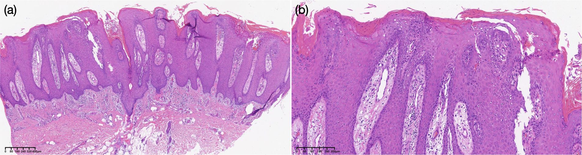 Before starting treatment, a comprehensive set of laboratory and instrumental tests, including chest X-ray, electrocardiogram (ECG), complete blood count, complete liver profile, creatinine, antinuclear antibody, acquired immunodeficiency syndrome screening, rapid plasma regain test, hepatitis B virus serologic markers, hepatitis C virus antibody, and tuberculosis assay, yielded negative results, except for C-reactive protein (31.10 mg/L) erythrocyte sedimentation (23 mm/h), and total IgE (108 IU/L). Moreover, staphylococcus aureus and proteus mirabilis were detected on verrucous lesions. A biopsy from a verrucous lesion of the left leg revealed hyperkeratosis, neutrophil infiltration in the corner layer, wart-like hyperplasia of the epidermis, microabscess formed by the accumulation of neutrophils in the spinous layer (Figures 2a, b), PAS staining (–), anti-acid staining (–).