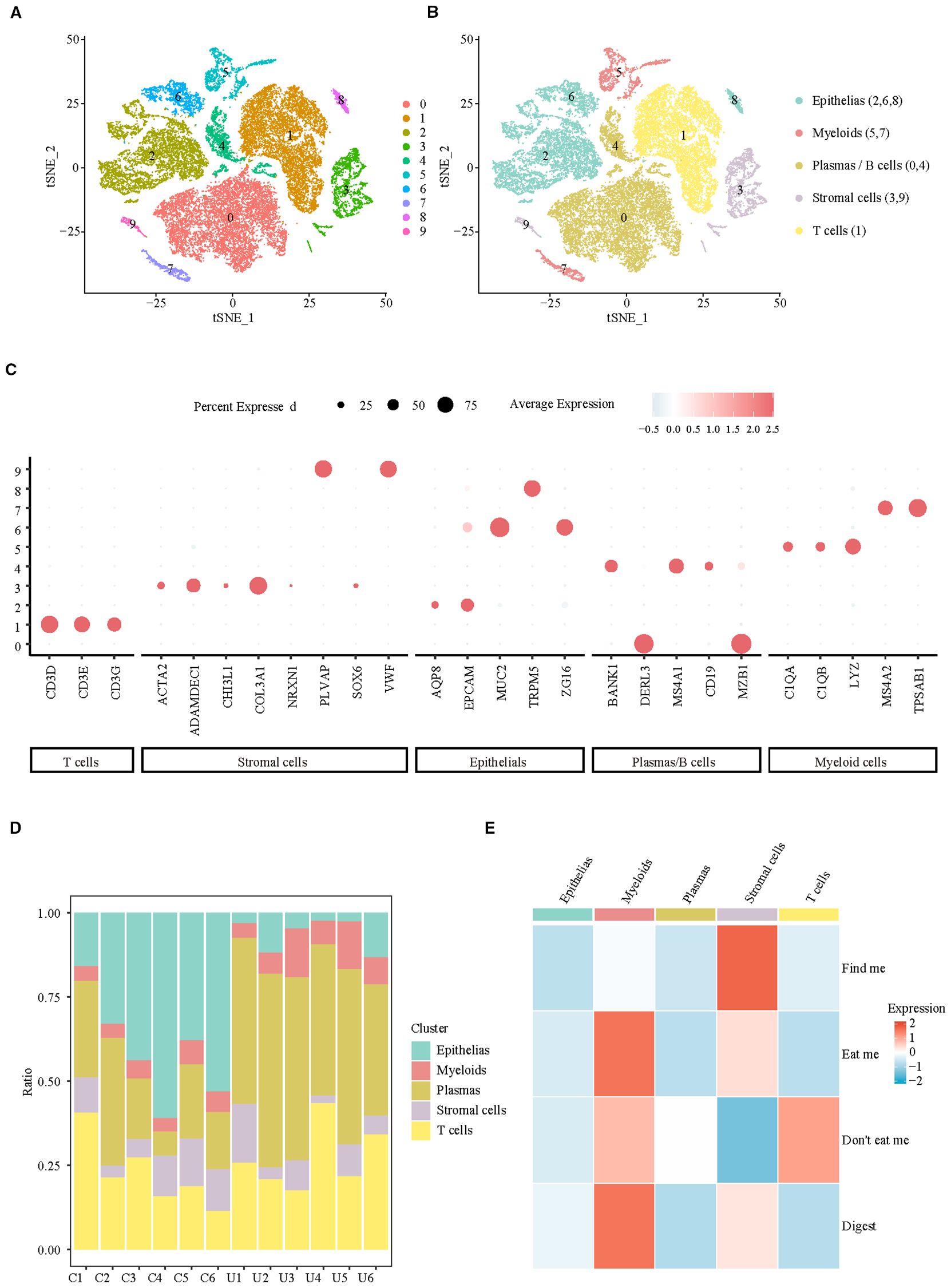 To clarify the changes in colon efferocytosis signals at the cellular level in UC patients, a total of 37,433 cells from colonic biopsies of CON (n=6) and UC (n=6) active patients were included in the analysis. Subsequently, we filtered out the low-quality cells, resulting in 32,972 cells that were identified as belonging to 10 clusters (Figure 1A, Supplementary Figure S1) and 5 major cell populations (Figure 1B). The Dotplot was utilized to illustrate the expression of published markers within cell clusters (12), thereby substantiating the reliability of cell type identification (Figure 1C). The analysis of cellular proportions in various samples revealed that, compared to the control group, patients with ulcerative colitis (UC) exhibited a significant decrease in the proportion of colonic epithelial cells, along with a notable increase in the levels of myeloid cells and Plasma/B cells (Figure 1D). Analysis of efferocytosis signaling indicates that myeloid cells exhibit the strongest eat-me and digest signals, while the ‘find me’ chemotactic function, which is crucial for efferocytosis chemotaxis, is predominantly activated in stromal cells (Figure 1E). These findings suggest that the enhancement of efferocytosis signaling in ulcerative colitis (UC) is primarily associated with myeloid and stromal cells.