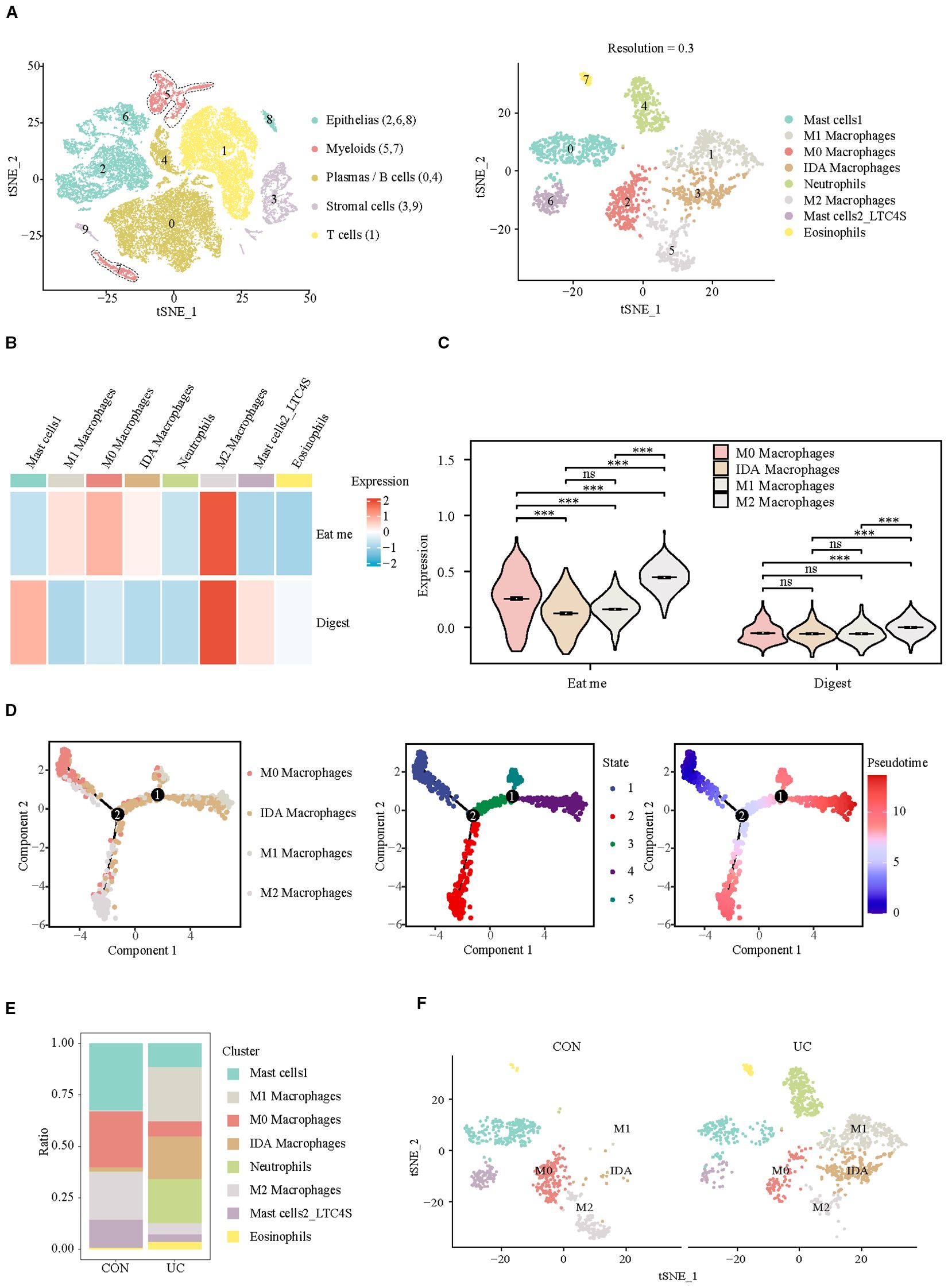 Figure 2. Analysis of efferocytosis in myeloid cell subsets. (A) UMAP representation of the detailed subpopulations of myeloid cells. (B) Heatmap of efferocytosis scores in subpopulations of myeloid cells. (C) Violin plot of efferocytosis scores of different macrophage subpopulations. (D) Trajectory analysis reveals the differentiation of different macrophage subpopulations into two distinct directions (M1/IDA or M2). (E) Barplots representing the proportions of subpopulations within myeloid cells. (F) UMAP visualization of myeloid cell subpopulations across CON and UC group. ***P< 0.001, ns, no significance.