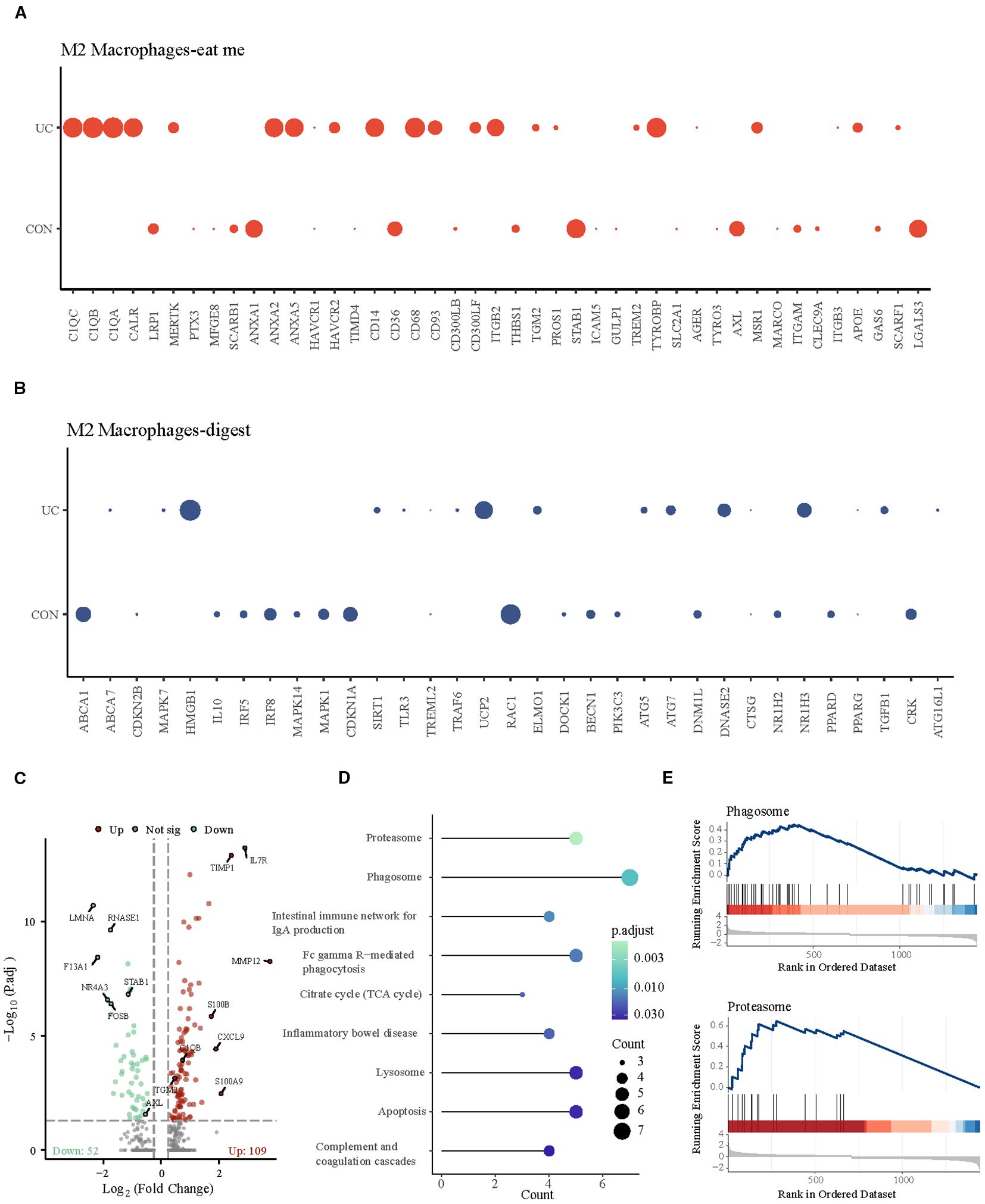 Figure 3. Analysis of M2 macrophage efferocytosis signaling between CON and UC group. (A) Dotplot representation of the expression abundance of chemotactic (eat-me) molecules in M2 macrophage subpopulations across groups. (B) Dotplot representation of the expression abundance of digest molecules in M2 macrophage subpopulations across groups. (C) Volcano plot representation of differential gene expression of M2 macrophage subpopulations between CON and UC group. (D) Stick plot displays the KEGG enrichment pathways of differential genes in M2 subpopulations. (D) Gene set enriched in the phagosome pathway (NES = 2.27, FDR = 0.005189). (E) Gene set enriched in the proteasome pathway (NES = 2.35, FDR = 0.00647092).