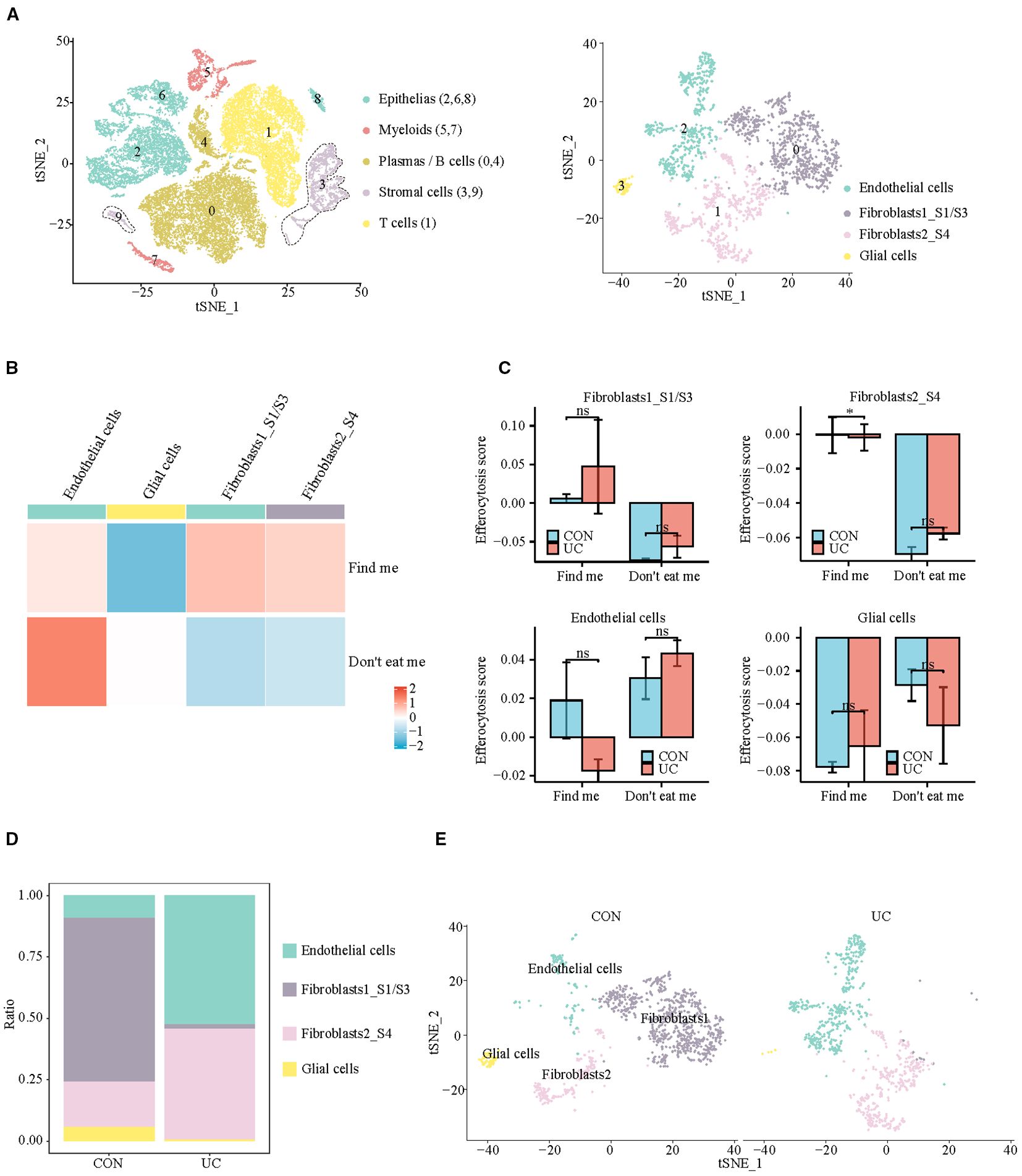 Figure 4. Analysis of efferocytosis in stromal cell subsets. (A) UMAP representation of the detailed subpopulations of stromal cells. (B) Heatmap of efferocytosis scores in subpopulations of stromal cells. (C) Barplot of efferocytosis scores in subpopulations of stromal cells across groups. (D) Barplot representing the proportions of subpopulations within stromal cells. (E) UMAP visualization of stromal cell subpopulations across CON and UC group.