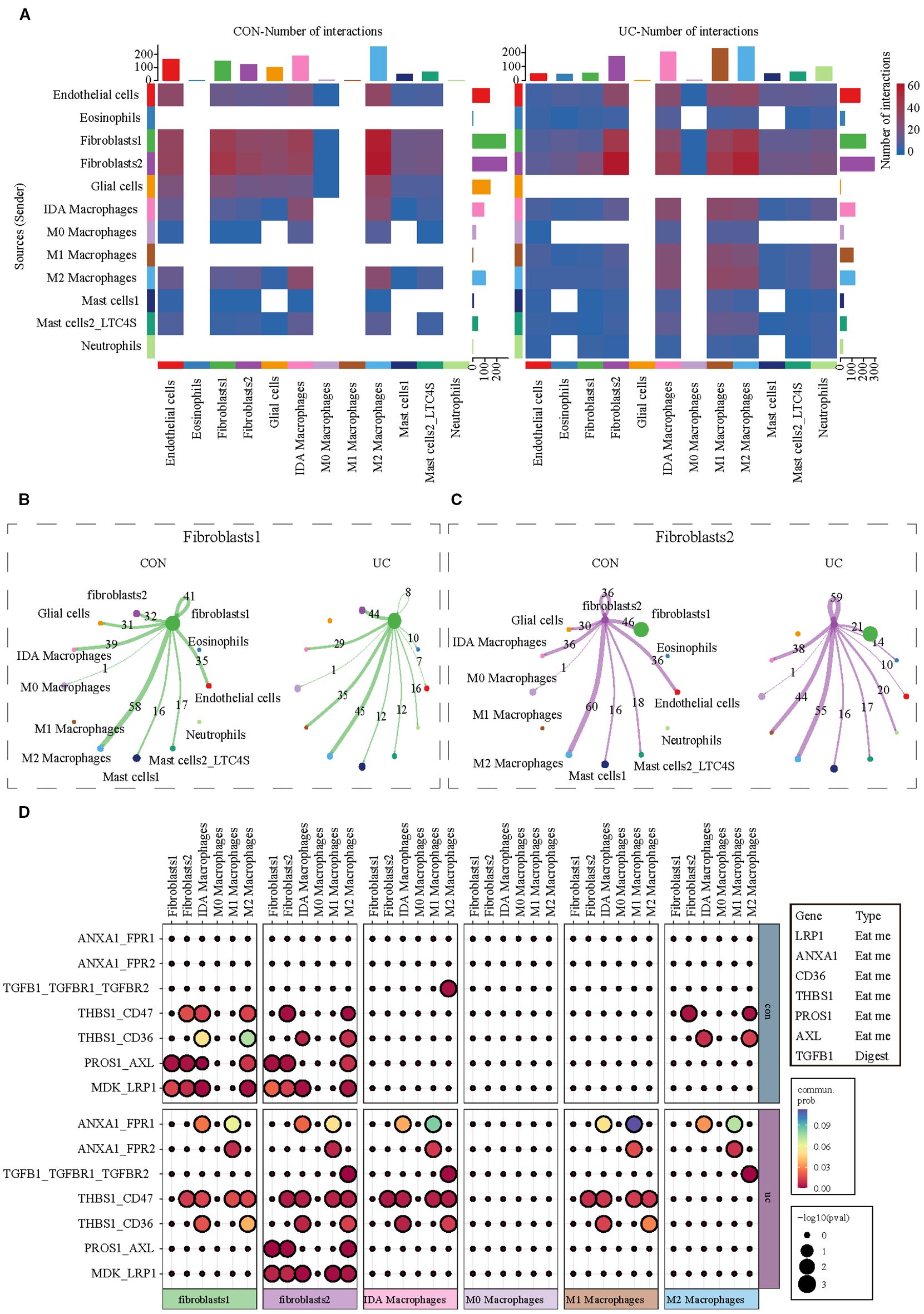 Figure 5. Analysis of cell communication between myeloid cells and stromal cells. (A) CellChat analysis indicating alterations in cell communication between stromal cells and myeloid cells between CON and UC colon tissues. (B) The communication network between Fibroblast 1 and myeloid cell subtypes. (C) The communication network between Fibroblast 2 and myeloid cell subtypes. (D) The heatmap illustrates the changes in efferocytosis-related ligand-receptor signals between fibroblasts and macrophages across different groups.