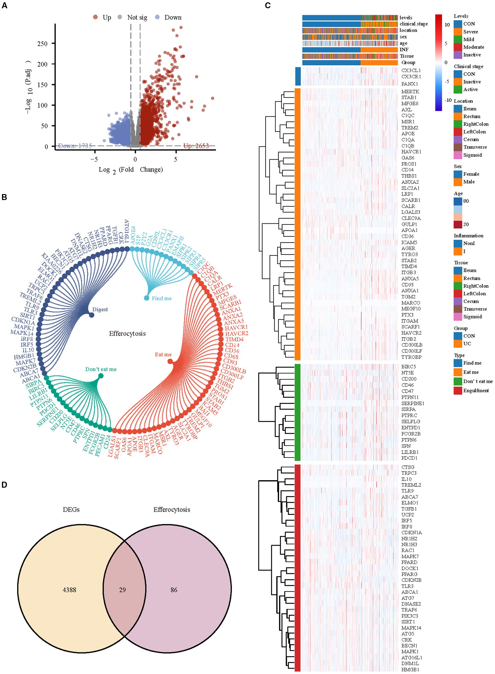 Efferocytosis, also known as apoptotic cell clearance or programmed cell removal, is a specialized form of phagocytosis that plays a pivotal role in maintaining tissue homeostasis, mitigating post-injury inflammatory responses, and facilitating tissue regeneration (17). Emerging evidence highlights its regulatory function in modulating inflammatory cascades, positioning efferocytosis as a promising therapeutic target for colitis management (5, 18). This therapeutic strategy shows considerable promise as a future direction for the treatment of the disease in ongoing research. Nonetheless, the pathological implications of efferocytosis in the context of ulcerative colitis are not yet fully elucidated. Consequently, deepening our understanding of efferocytosis and pinpointing novel therapeutic targets for UC is of critical importance.