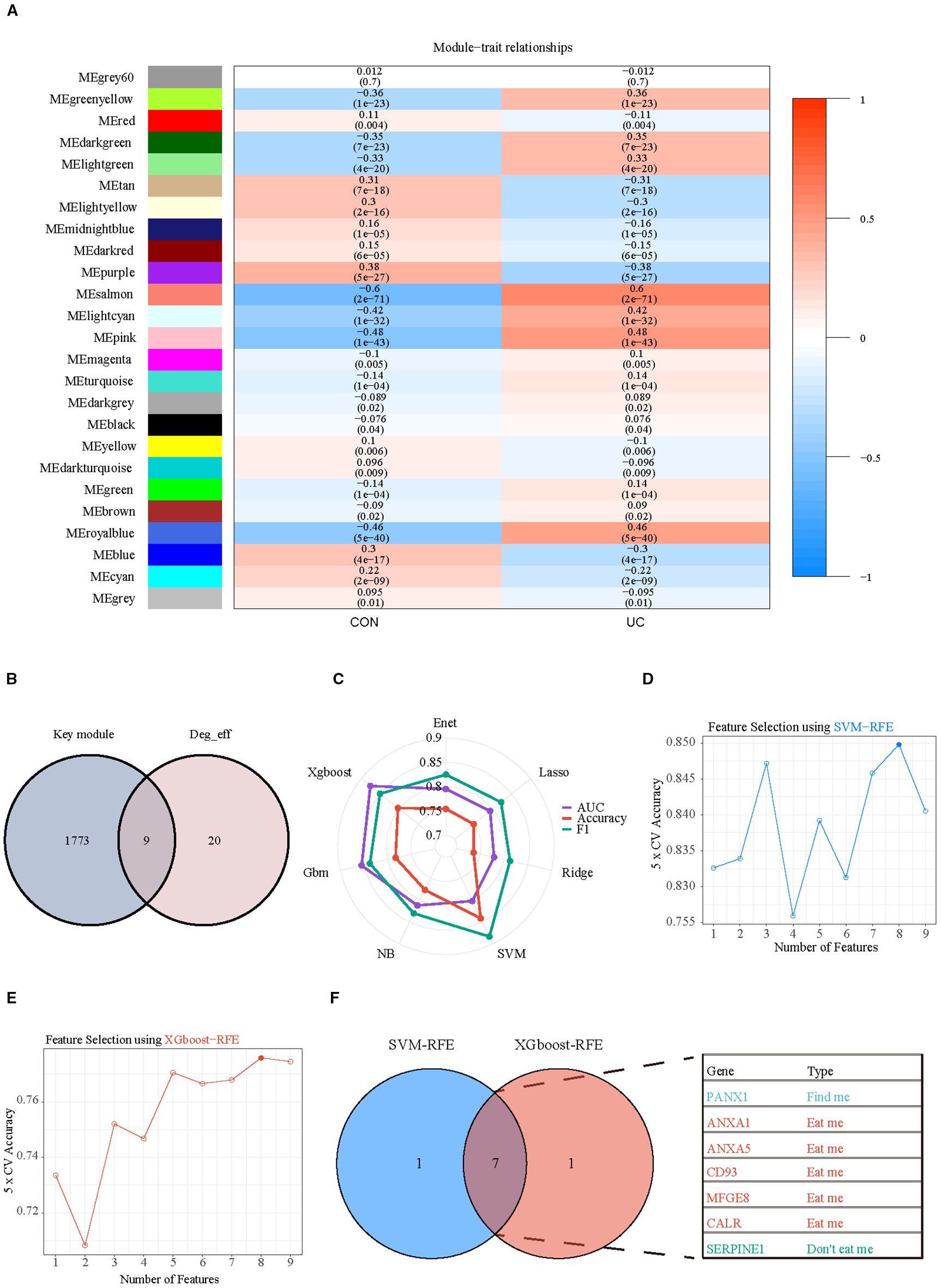Subsequently, WGCNA with fit index ≥ 0.85 and β= 7 was applied to further screen the differential efferocytosis-related genes associated with UC (Supplementary Figures S4A–C). In a total of 25 co-expression modules, the Pink, Salmon, RoyalBlue, and LightCyan modules showed a strong positive correlation with UC (Figure 7A). By intersecting the genes from the key modules with the differential efferocytosis-related genes, a total of 9 characteristic genes were obtained (Figure 7B). Then, we developed a machine learning framework designed to identify hub genes by addressing seven distinct binary classification tasks. Through systematic evaluation of algorithm performance metrics (AUC, accuracy, and F1-score), our comparative analysis revealed that support vector machine (SVM) and extreme gradient boosting (XGBoost) exhibited superior predictive efficacy compared to other models (Figure 7C). By integrating Recursive Feature Elimination (RFE) for feature selection, we identified seven hub genes (Panx1, Anxa1, Anxa5, Cd93, Mfge8, Calr, and Serpine1) that were consistently prioritized by both algorithms (Figures 7D–F).