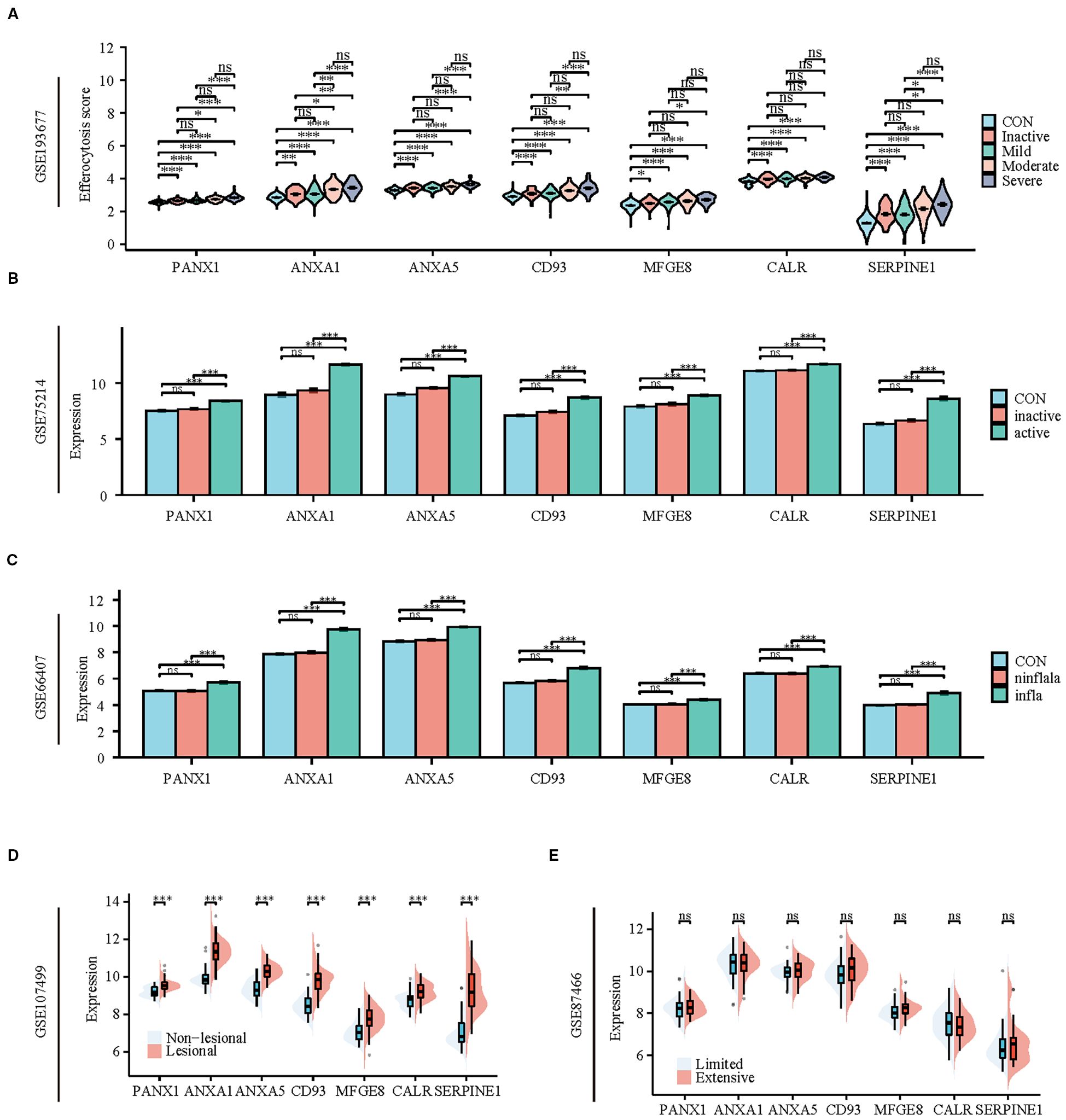 Figure 8. Patients with active UC and inflammatory tissues of the colon exhibit high expression of hub genes and TFs of efferocytosis. (A) Violin plot display the expression of hub genes between healthy individuals and patients with varying degrees of severity. (B) Bar charts display the expression of hub genes between healthy individuals and patients in active and inactive stage. (C) Bar charts display the expression of hub genes among healthy colons, inflammatory colons, and non-inflammatory colons. (D) Split violin plot revealing the expression differences in hub genes between lesional tissues and non-lesional tissues. (E) Split violin plot revealing the expression differences in hub genes between limited colitis and extensive colitis. *P < 0.05, **P < 0.01, ***P < 0.001, ns, not significant.