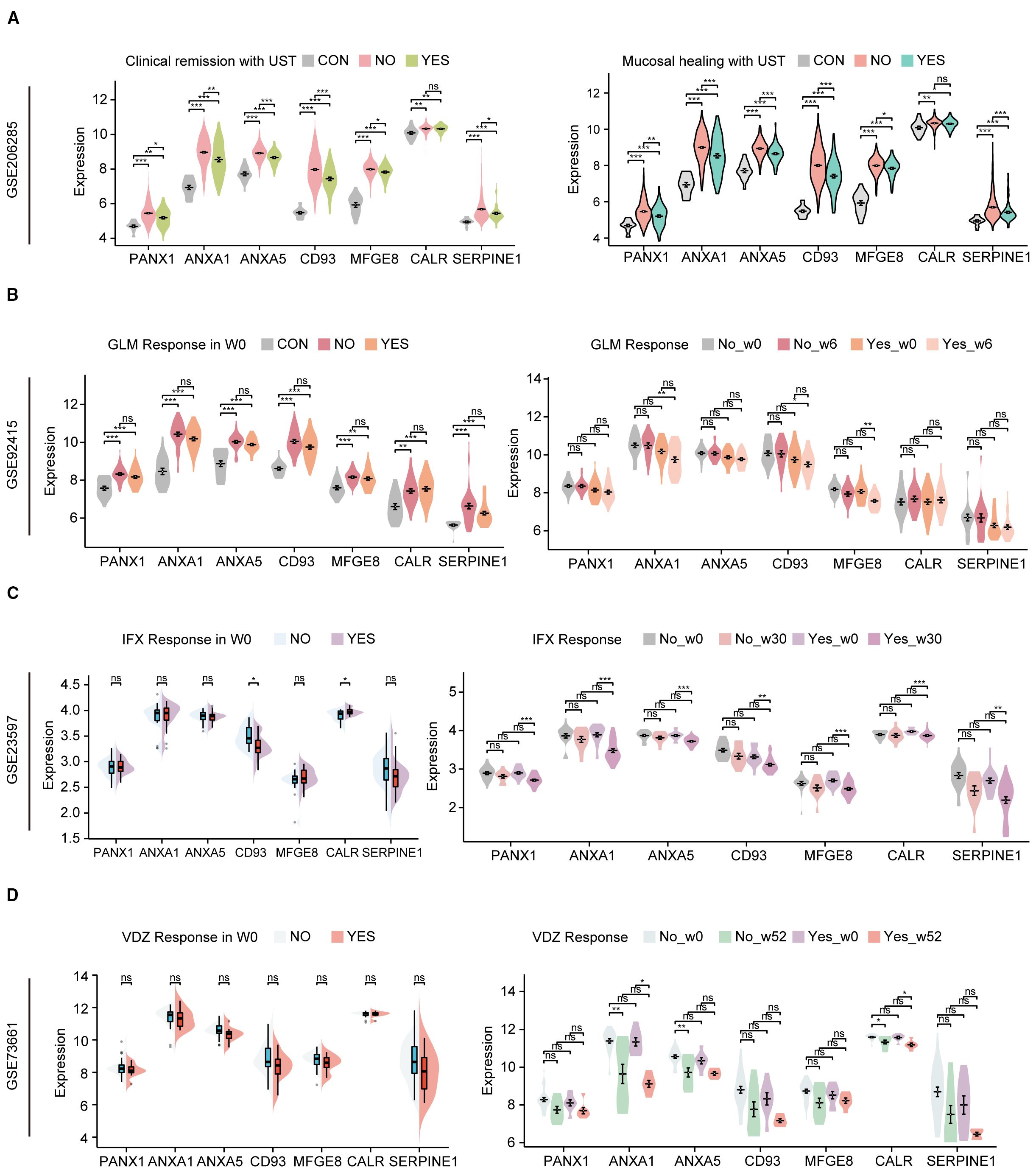 Figure 9. Hub genes of efferocytosis are associated with UC patients’ response to biologics. (A) The relative expression levels of hub genes in the colonic mucosa of healthy controls, UC patients in not responding and responding groups before UST therapy in GSE206285 (B) The relative expression levels of hubs in the colonic mucosal of healthy controls, UC patients in responding and non-responding groups before and after GLM treatment in GSE92415. (C) The relative expression levels of hubs in the colonic mucosal of healthy controls, UC patients in responding and non-responding groups before and after IFX treatment in GSE23597. (D) The relative expression levels of hub genes in the colonic mucosa of healthy controls, UC patients in not responding and responding groups before and after VDZ therapy in GSE73661. UST, ustekinumab; GLM, golimumab; IFX, infliximab; VDZ, vedolizumab. *P < 0.05, **P< 0.01, ***P < 0.001, ns, not significant.