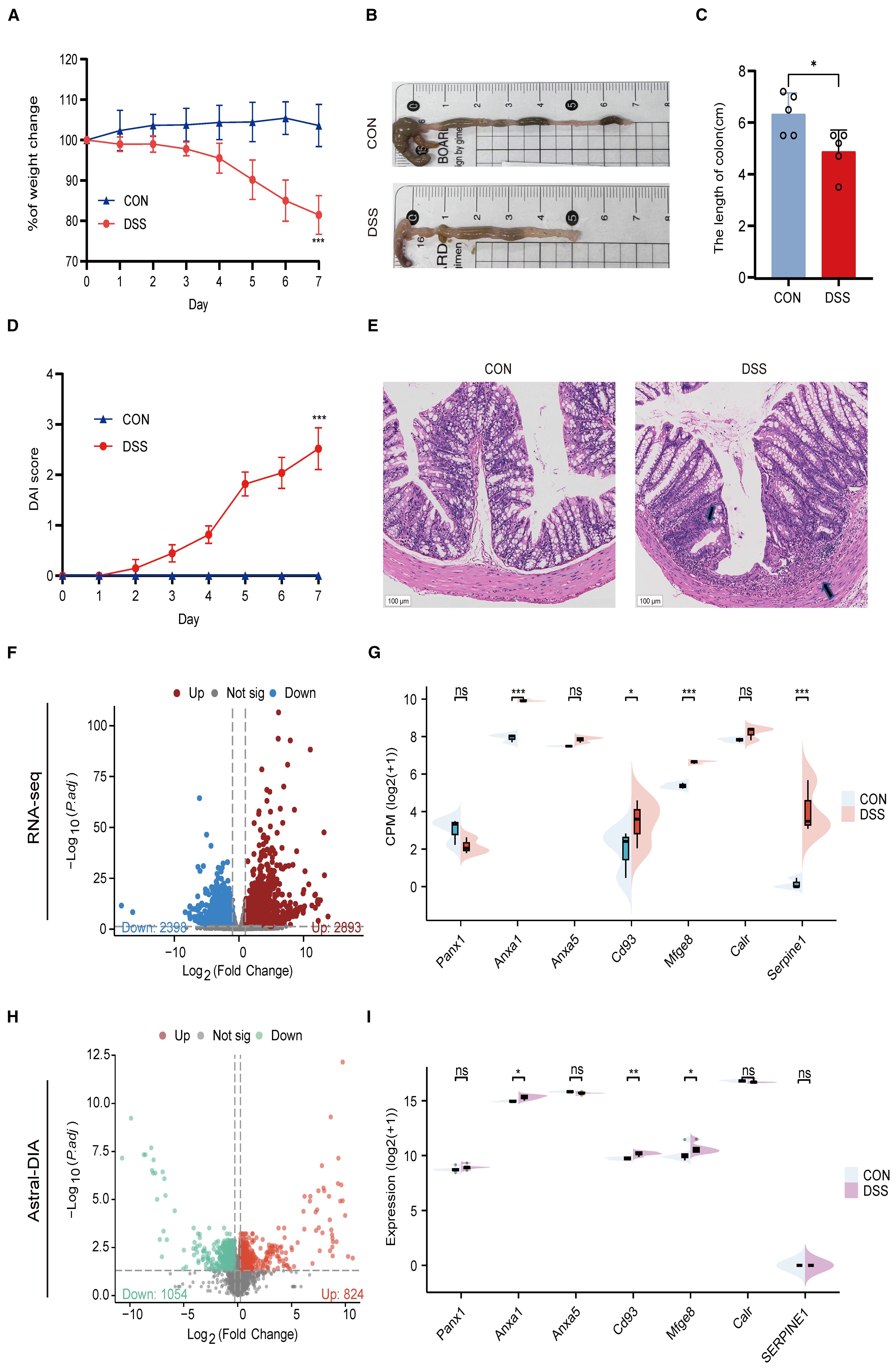 Figure 10. Validation of hub genes in a DSS-induced colitis model. (A) Body weight changes between CON and UC mice. (B) Representative images of colons between CON and UC mice. (C) Colonic length changes between CON and UC mice. (D) DAI score changes between CON and UC mice. (E) Representative images of HE staining in the colon tissues (magnification ×100) and arrows indicate inflammatory infiltrates. (F) Volcano plot representing differential gene expression between CON and DSS mice. (G) Split violin plot revealing the expression differences in hub genes between CON and DSS mice. (H) Volcano plot representing differential protein expression between CON and DSS mice. (I) Split violin plot revealing the expression differences in hub proteins between CON and DSS mice. Data are shown as mean ± SD. *P<0.05, **P<0.01, ***P<0.001, ns, not significant.