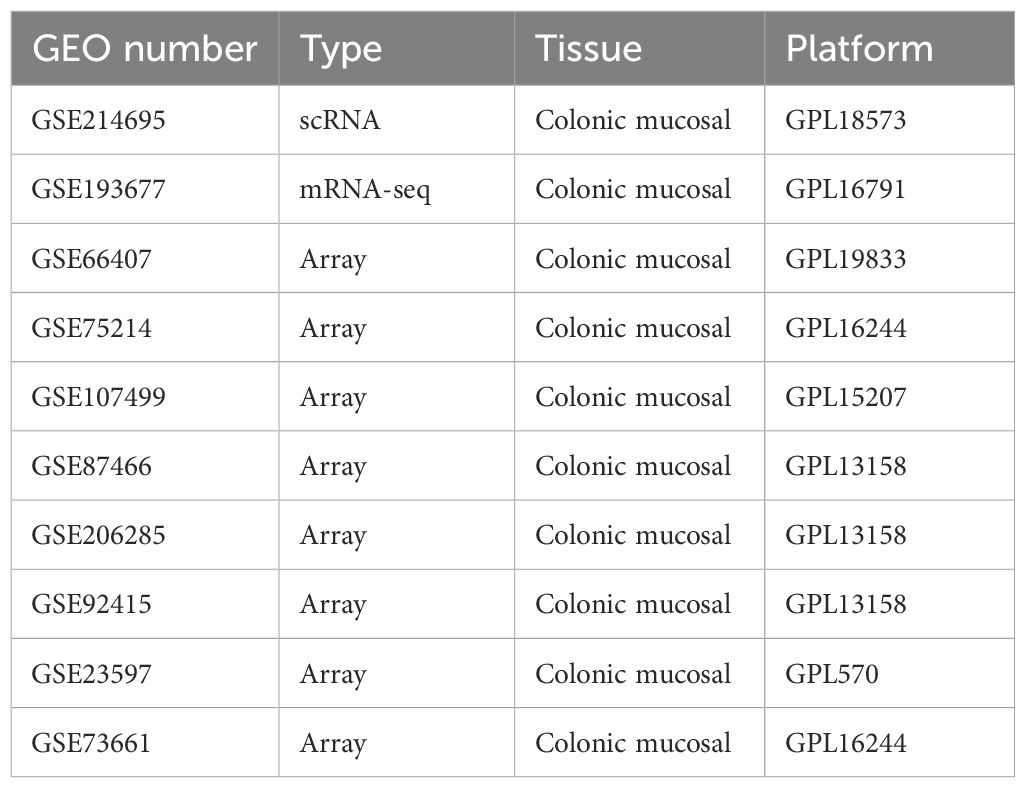We searched GEO databases using the keyword “ulcerative colitis,” the filter criteria were as follows: ① human; ② the dataset had at least five healthy control and five UC samples. Finally, one single-cell RNA sequencing dataset (GSE214695), eight mRNA datasets (GSE193677, GSE66407, GSE75214, GSE107499, GSE206285, GSE92415, GSE23597, GSE73661) were included (Table 1).