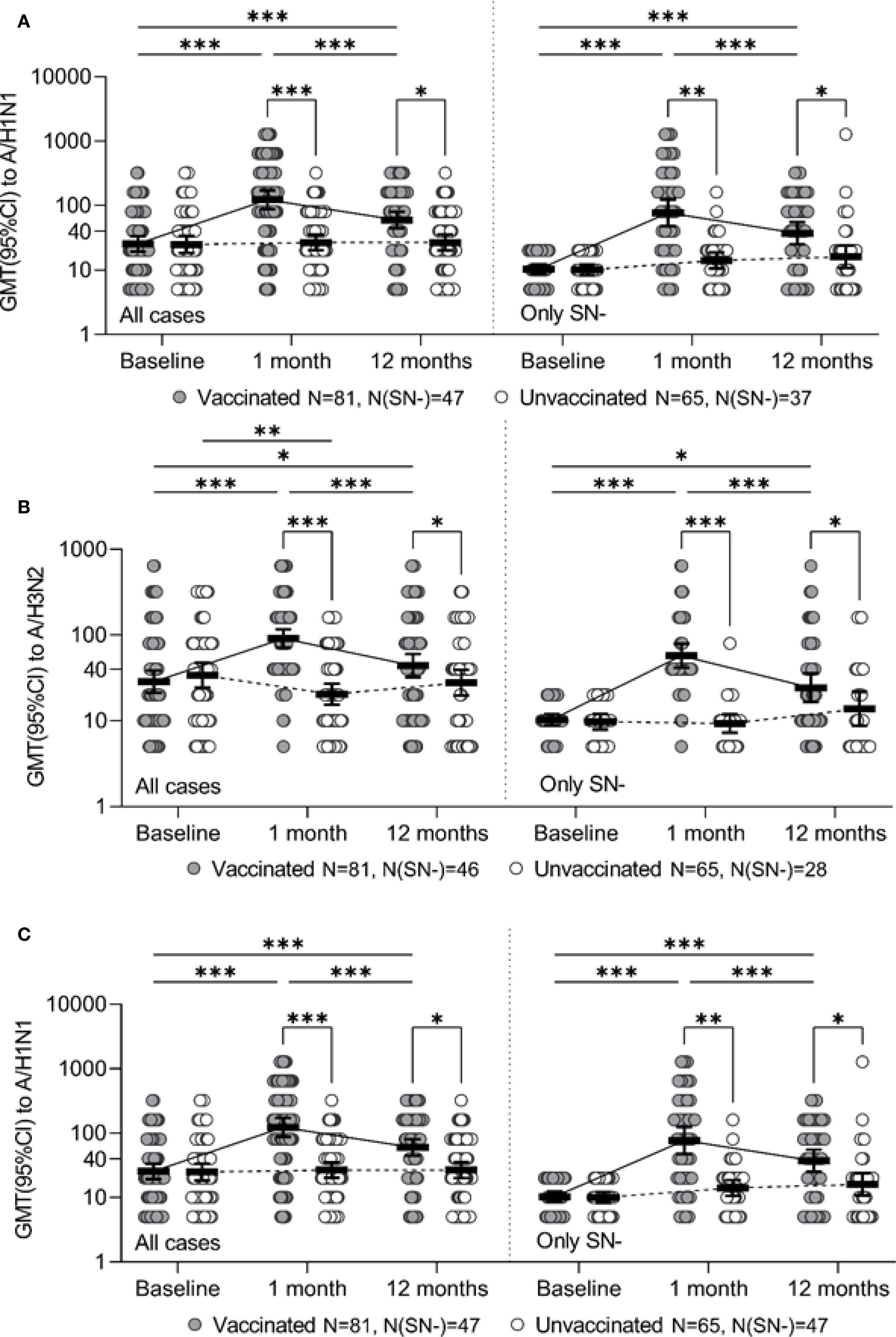 Figure 1. Ab level to the specified strain for the entire study period for all study participants (all cases) and for initially seronegative (only SN-), individual values, geometric mean value and its 95% confidence interval (GMT and 95% CI) are given. Panels A, B, and C represent strains A/H3N2, A/H1N1, and B/Yamagata, respectively. * - p ≤0.05, ** - p <0.01, *** - p <0.001, the corresponding contrasts were constructed within the framework of a robust linear model of mixed effects with the Benjamini-Hochberg correction for multiple comparisons.