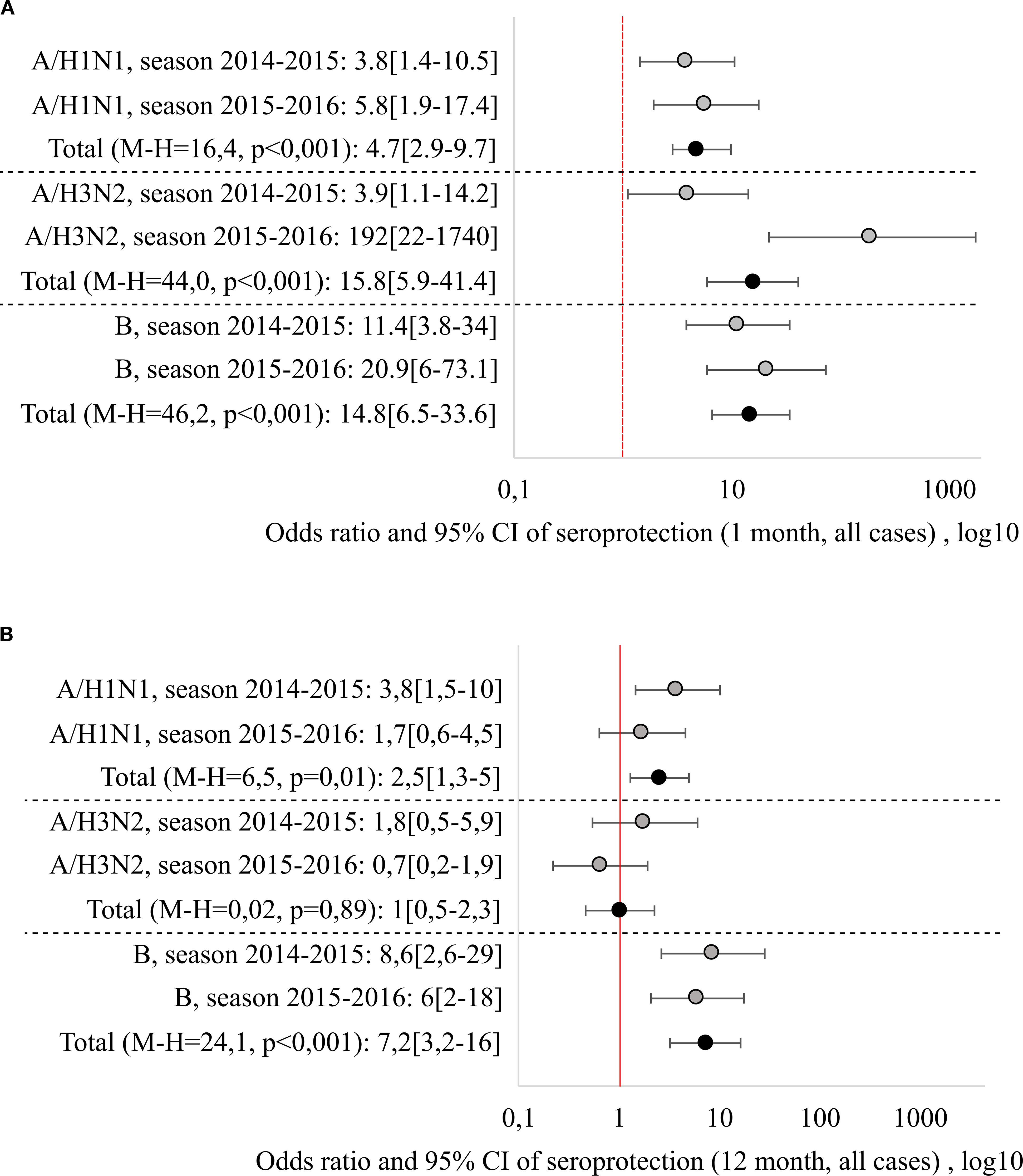 Figure 2. Relative risks of reaching seroprotective level 1 month (A) and 12 months (B) after vaccination/beginning of observation, generalization by seasons was carried out by the Mantel-Haenszel method, with the calculation of the Cochran-Mantel-Hensel criterion.