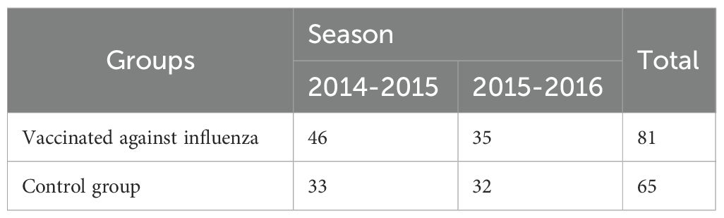 The sample size calculation was based on immunogenicity criteria, particularly a seroprotection level of at least 70%. In a pilot sample of 30 patients, the proportion of patients with a protective level of Ab (≥40) was assessed; it was 27% to the A/H1N1 strain, 34% to the A/H3N2 strain and 19% to the B strain. With an expected post-vaccination increase to at least 70%, the calculated effect sizes were 0.88 for the A/H1N1 strain, 0.74 for the A/H3N2 strain and 1.08 for the B strain. Using the pwr package and the pwr.2p.test function based on the specified information for a study power of 80%, the minimum size of each study group was calculated, which was 20 for the A/H1N1 strain, 29 for the A/H3N2 strain and 14 for the B strain (30). The total number of study groups (Table 1) was 81 people in the vaccinated group and 65 patients in the control group, of which 79 patients were recruited in the 2014–2015 season. (N = 46 in the vaccinated group and N = 33 in the control group) and 67 in the 2015–2016 season. (N = 35 in the vaccinated group and N = 32 in the control group).