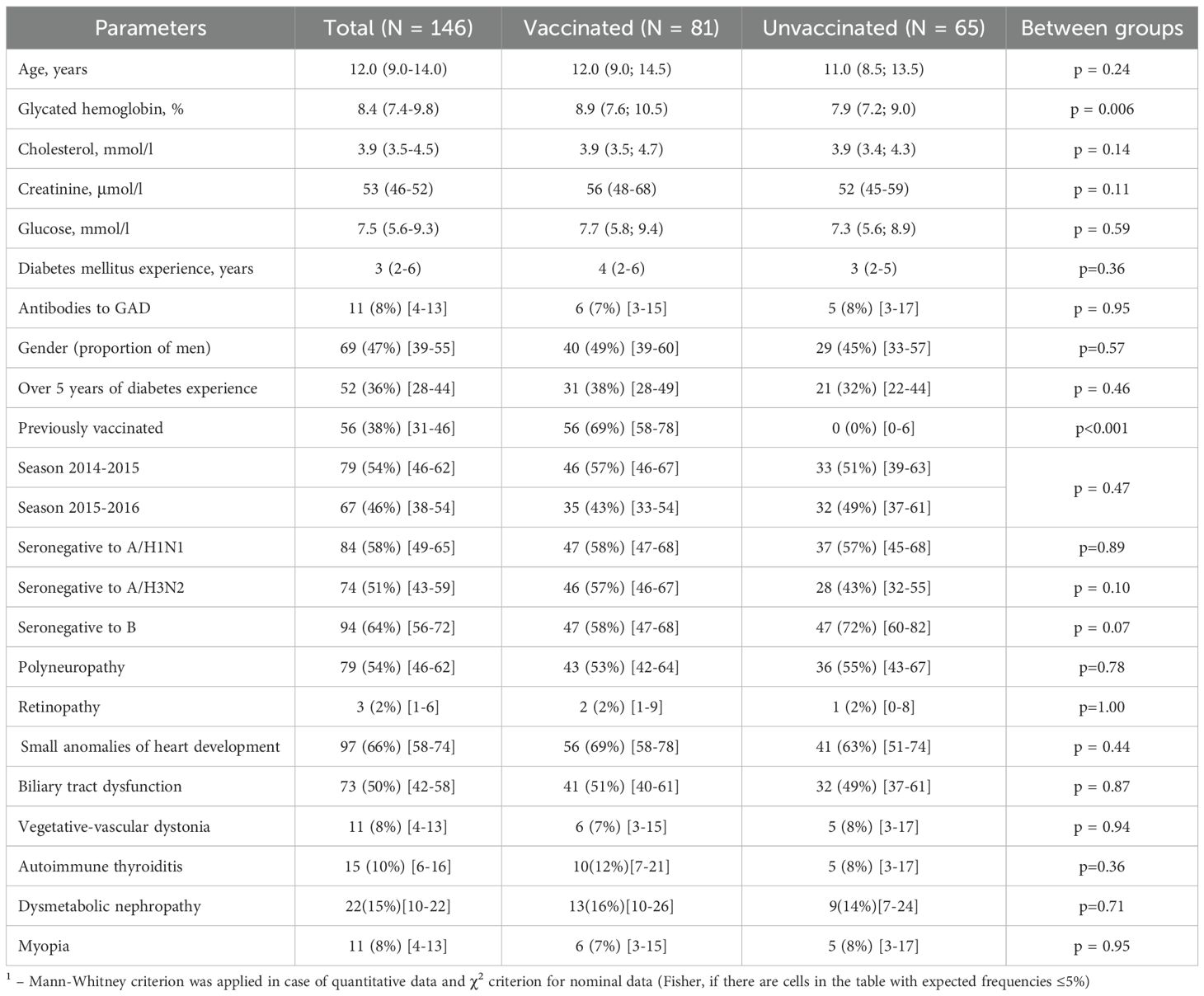 Methods: A prospective non-randomized study during 2 epidemic seasons included 146 children with T1D at the age of 12.0 (9.0-14.0) years; the main group consisted of 81 patients vaccinated against influenza, the control group included 65 unvaccinated children. Antibody (Ab) levels to influenza viruses were evaluated using the hemagglutination inhibition assay before vaccination, one month and 12 months after vaccination.