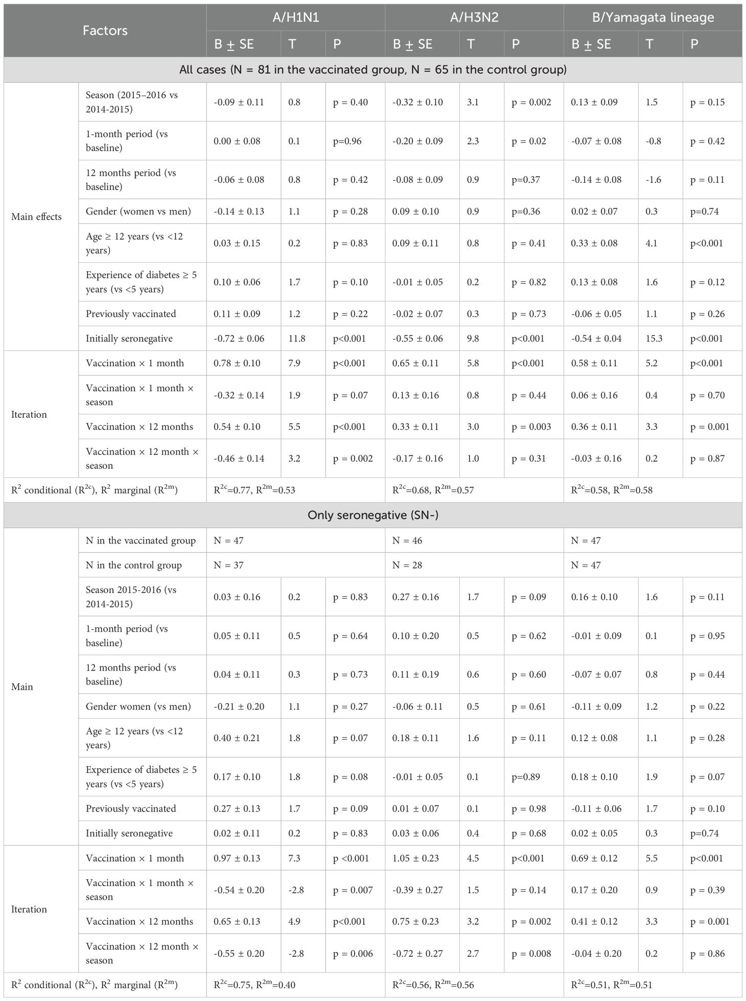 To compare two unrelated samples by quantitative indicator, the Mann-Whitney test was employed. Longitudinal analysis of characteristic changes and inter-group comparisons were performed by constructing a robust linear mixed effects model (RLMEM) (31). The statistical significance of the model coefficients was determined using the Satterthwaite approximation for degrees of freedom (32). Post hoc comparisons (between groups at different time points and within groups over time) were performed by constructing the relevant contrasts using the calculated model and the emmeans package, with the Benjamini-Hochberg correction applied (33). The construction of the model for the Ab level was carried out on the data after the logarithmic transformation, for the remaining characteristics, modeling was carried out on the initial data. As fixed factors in the analysis of the formation of post-vaccination immunity, the following were determined: time after vaccination (1 month, 12 months), vaccination season (2014-2015/2015-2016), gender (male/female), age group (≥12 years/<12 years), duration of T1D (≥5 years/<5 years), prior influenza vaccination (yes/no), the initial level of Ab to the analyzed strain (seropositive/seronegative). Individual patients were assigned as random factors. Marginal R2 and conditional R2 were calculated to assess the model quality (34).