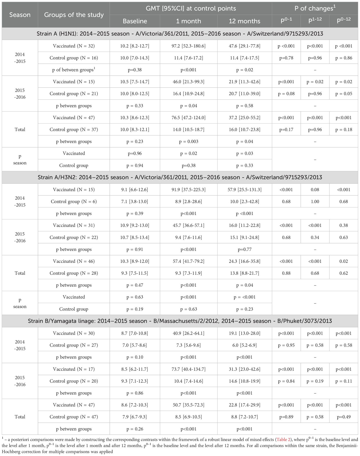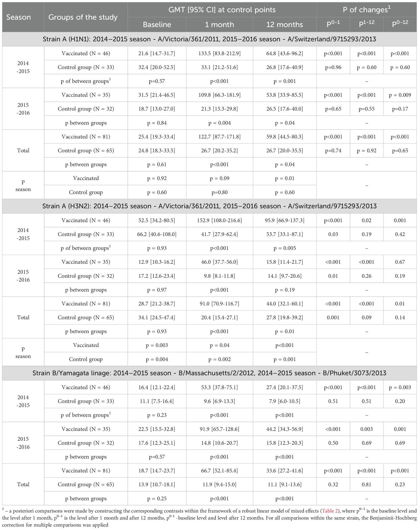 The seroconversion factor (GMFR) in the vaccinated group one month after vaccination compared to the baseline level was 3.2 [2.2-4.7] in the 2014–2015 season (p <0.001 vs. control), 4.1 [2.5-6.6] in the 2015–2016 season (p <0.001) and 3.6 [2.7-4.8] for both seasons combined (p <0.001); twelve months after vaccination - 1.7 [1.2-2.2] in the 2014–2015 season (p = 0.008 vs. control), 2.0 [1.4-2.8] in the 2015–2016 season (p = 0.01) and 1.8 [1.4-2.2] for both seasons combined (p <0.001) – see Table 6 (all cases).