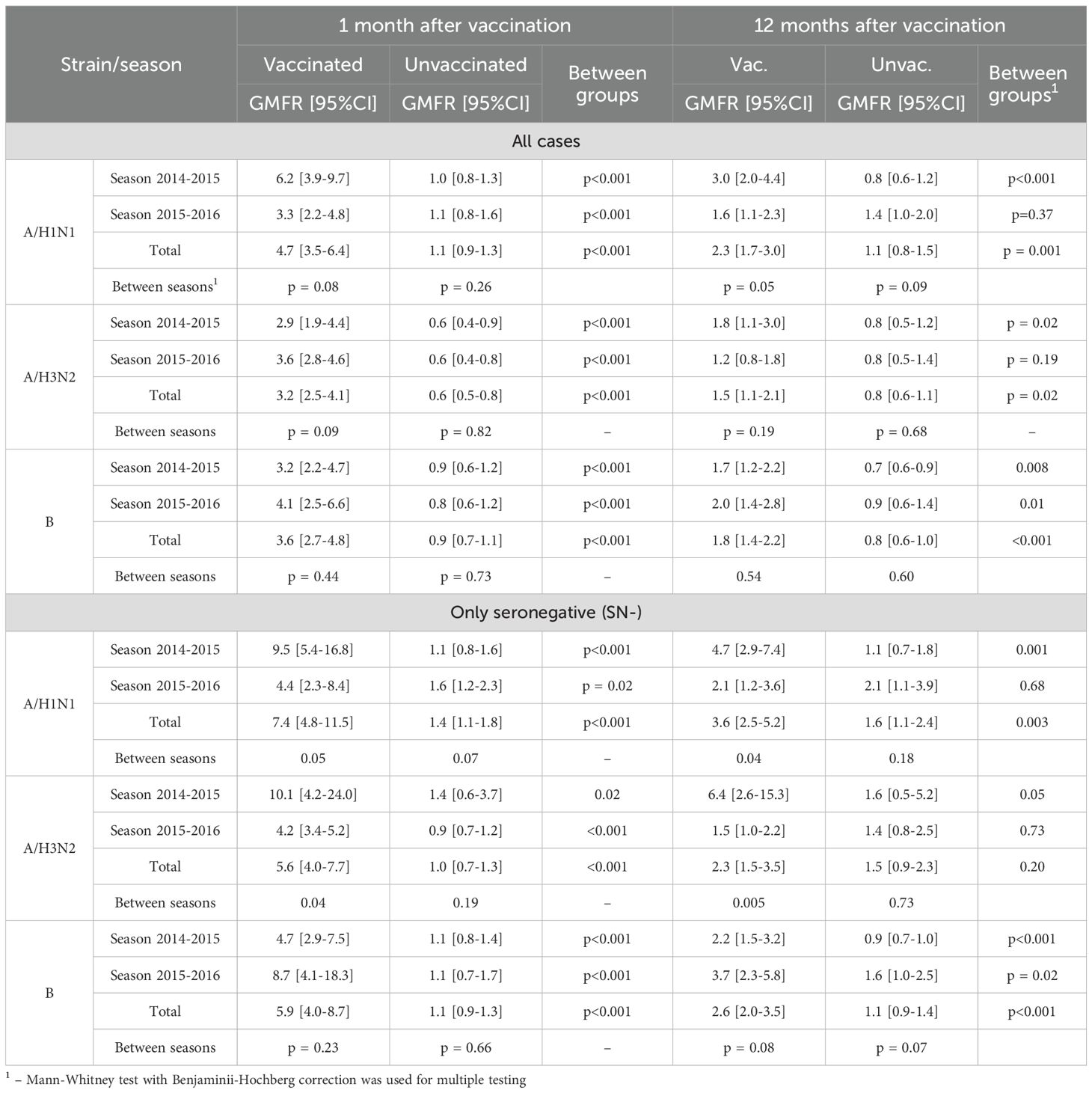 Among initially seronegative patients, the seroconversion factor (GMFR, or the fold increase in Ab) one month after vaccination was 4.7 [2.9-7.5] in the 2014–2015 season (p <0.001 compared to the control), 8.7 [4.1-18.3] in the 2015–2016 season (p <0.001), and 5.9 [4.0-8.7] total for two seasons (p <0.001); 12 months post-vaccination was 2.2 [1.5-3.2] in the 2014–2015 season (p <0.001), 3.7 [2.3-5.8] in the 2015–2016 season (p = 0.02), and 2.6 [2.0-3.5] total for two seasons (p <0.001) - Tables 6 and 7 (only SN-).
