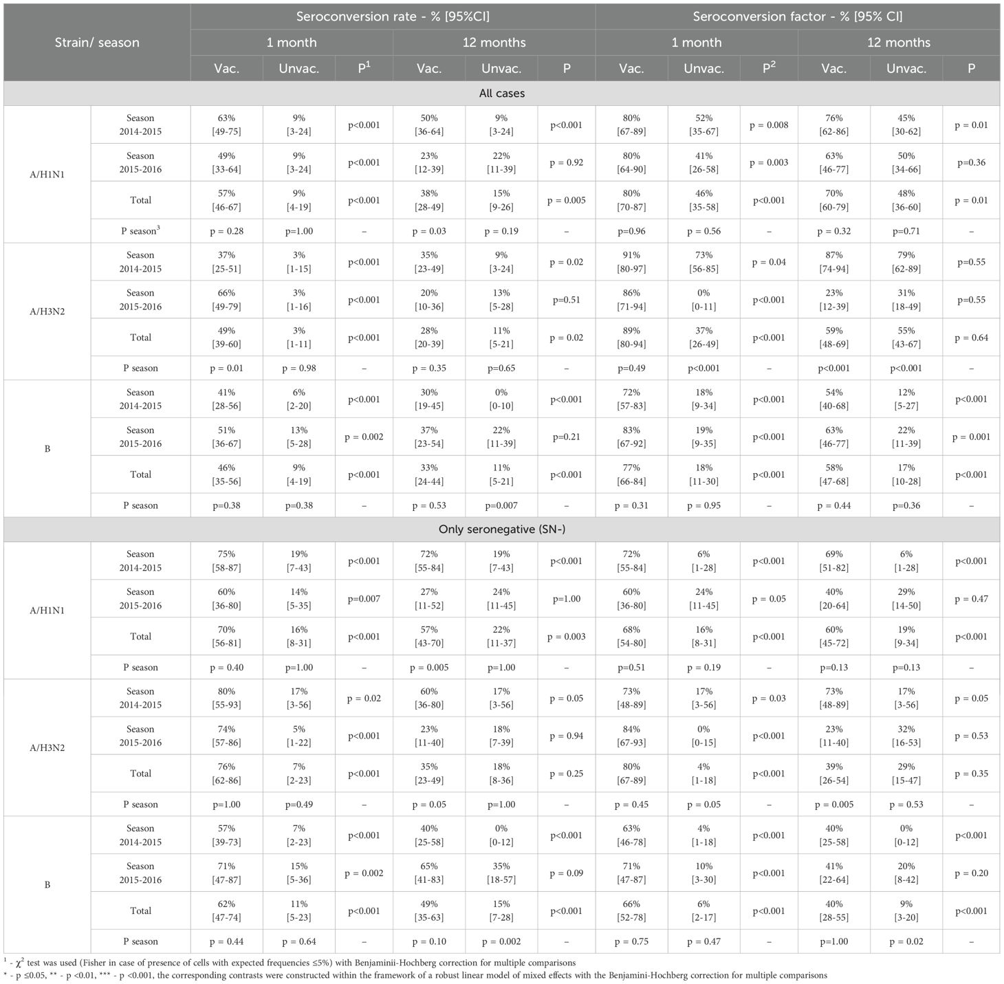 The seroconversion factor for two seasons to the A/H1N1 strain in the vaccinated group was 4.7 [3.5-6.4] vs. 1.1 [0.9-1.3] in the control group (p <0.001), to the A/H3N2 strain - 3.2 [2.5-4.1] vs. 0.6 [0.5-0.8] (p <0.001), for strain B - 3.6 [2.7-4.8] vs. 0.9 [0.7-1.1] (p <0.001), meeting CPMP criteria (which must be at least 2.5-fold) in total and in each of the seasons alone- Table 6 (all cases).