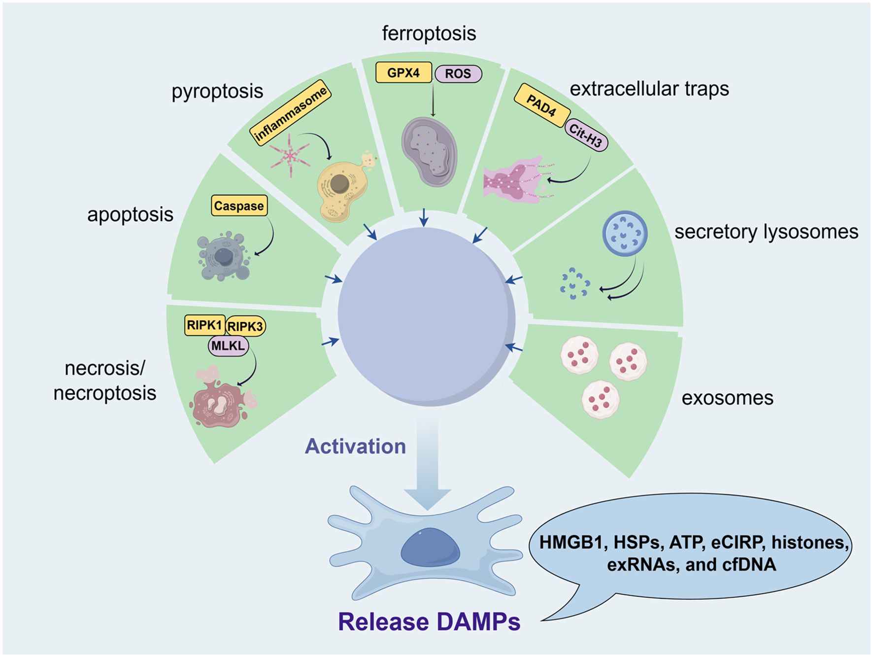 The immune system’s ability to distinguish ‘self’ from ‘non-self’ is fundamental in initiating immune responses against pathogens (11). While innate immune cells use PRRs like Toll-like receptors (TLRs) to detect pathogen-associated molecular patterns (PAMPs), they also recognize DAMPs released from stressed or damaged cells (12). DAMPs activate innate immune cells, including neutrophils (13), macrophages (14), and dendritic cells (15), leading to the release of cytokines and chemokines that trigger adaptive immune responses. DAMPs also stimulate non-immune cells such as epithelial (16), endothelial (17), and fibroblast cells (18), causing them to release inflammatory mediators. Major DAMPs include but are not limited to HMGB1, HSPs, ATP, extracellular cold-inducible RNA-binding protein (eCIRP), histones, extracellular RNAs (exRNAs), cell-free DNA (cfDNA), and uric acid (19). These molecules are detected by PRRs such as TLRs, NOD-like receptors (NLRs), and RIG-I-like receptors (20). Upon DAMP recognition, TLRs activate downstream signaling pathways involving myeloid differentiation primary response 88 (MyD88) (21) and TIR-domain-containing adapter-inducing interferon-β (TRIF) (22), which in turn activate transcription factors like activator protein-1 (AP-1) (23) and nuclear factor kappa B (NF-κB) (24). Additionally, DAMPs can signal through receptors like RAGE and P2X7 (25), further propagating inflammatory responses. This complex network of signaling pathways underscores the pivotal role of DAMPs in modulating immune and inflammatory responses.