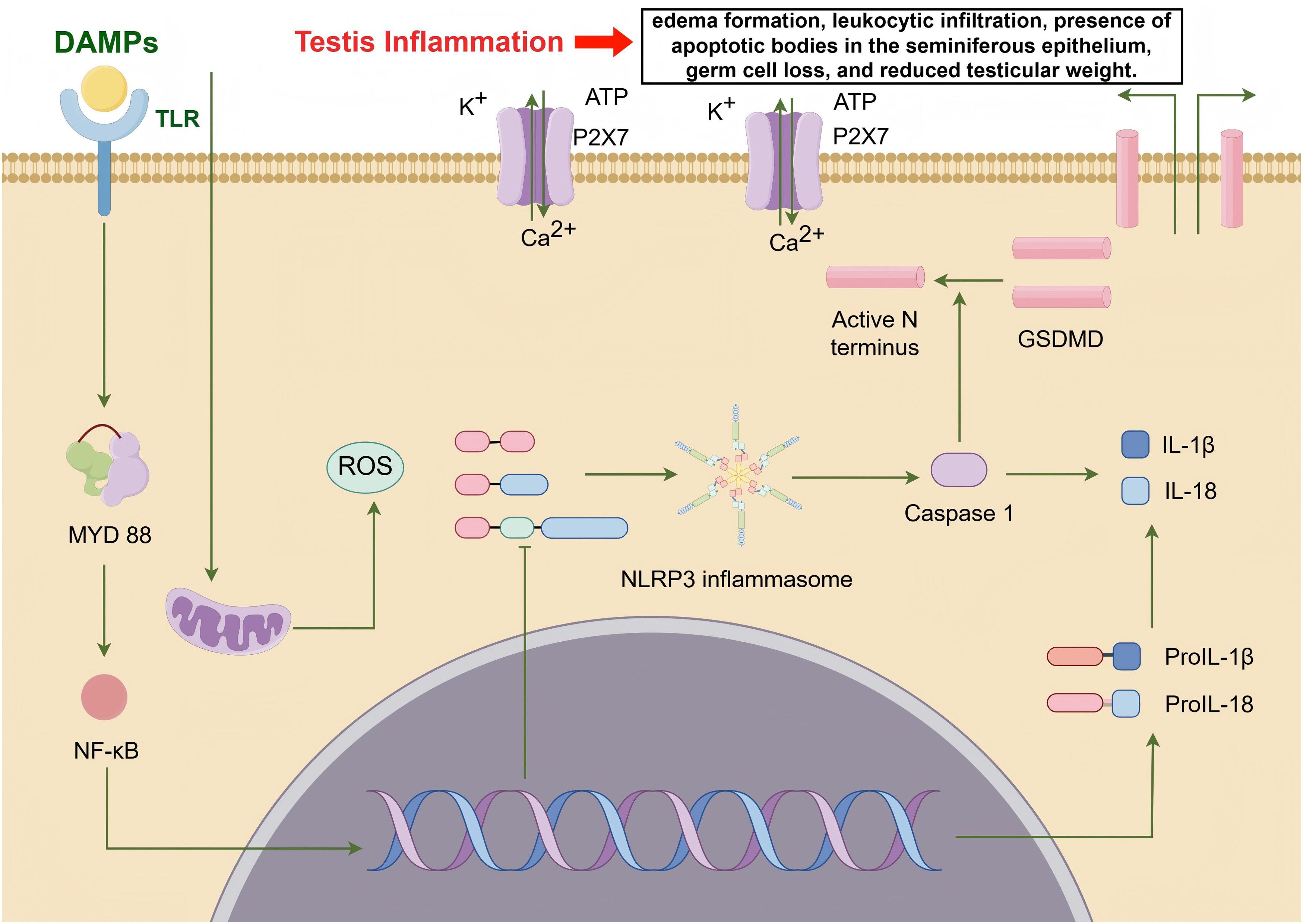 Figure 2. DAMPs promote testicular inflammation by regulating spermatogenesis through the activation of the inflammasome pathway (IP), particularly the NLRP3 inflammasome (from Figdraw, www.figdraw.com). DAMPs released by testicular cells activate the NLRP3 inflammasome via the TLR/MYD88/NF-κB signaling pathway, leading to the release of pro-inflammatory cytokines such as IL-1α, IL-1β, and TNF-α. Additionally, the NLRP3 inflammasome enhances the expression of Caspase-1 and IL-1β. Furthermore, DAMPs induce mitochondrial damage within cells, resulting in ROS accumulation and ATP efflux, thereby exacerbating testicular inflammation.