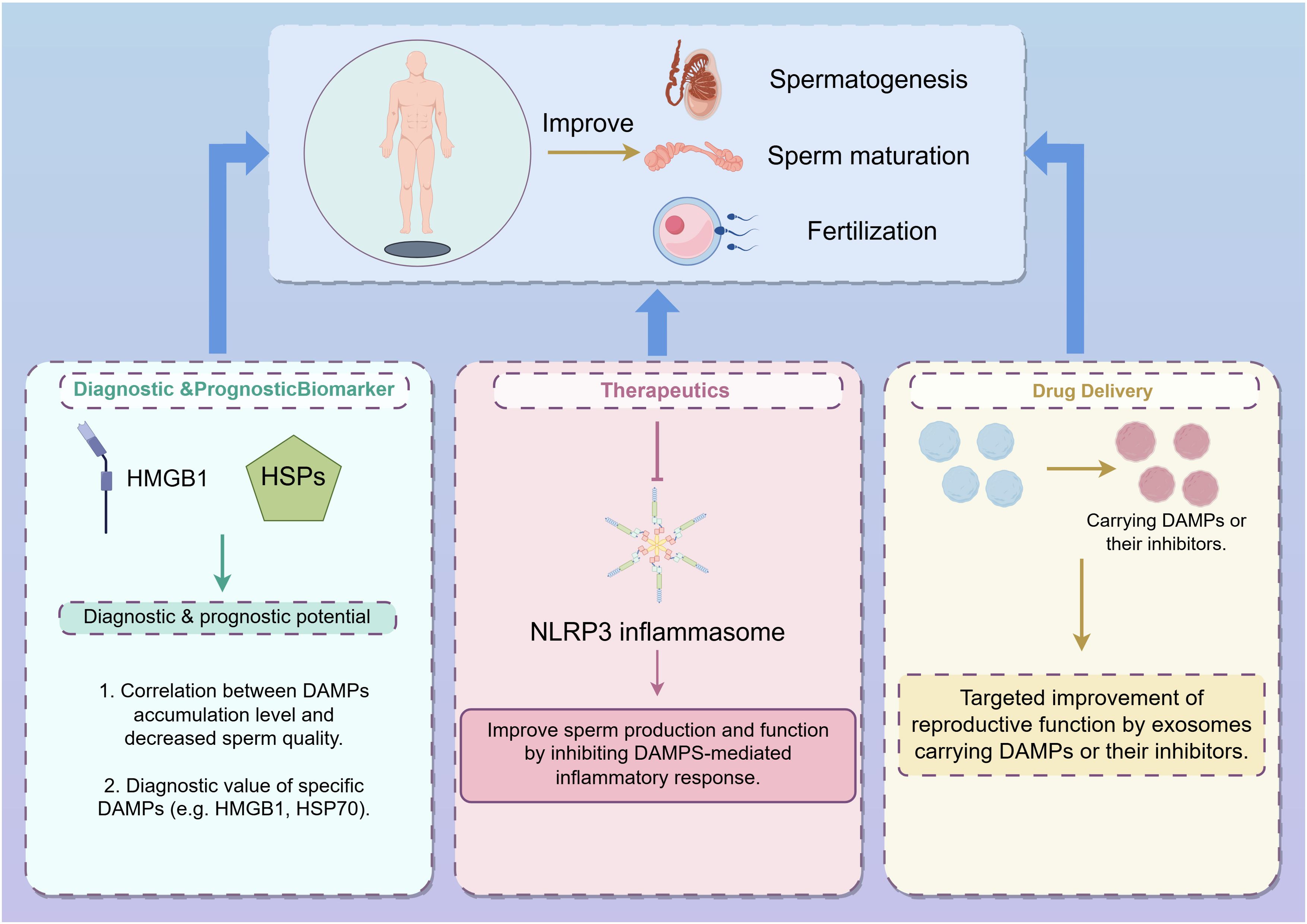 Our discussion illustrates the critical role of DAMPs in male infertility, emphasizing their potential as both biomarkers and therapeutic targets. The accumulation of DAMPs in the male reproductive tract and their effects on sperm quality and function present substantial implications for understanding the pathophysiology of male infertility. Targeting specific DAMPs or their signaling pathways could provide novel therapeutic avenues for managing and potentially reversing infertility conditions. Future research should focus on elucidating the precise molecular interactions between DAMPs and reproductive cells, as well as identifying specific DAMPs that could serve as reliable diagnostic markers or therapeutic targets. Investigations into how these molecules contribute to immune responses and cellular stress in the context of male infertility are crucial. Additionally, the development of targeted therapies aimed at modulating DAMPs could offer new strategies for improving treatment outcomes. In summary, the role of DAMPs in male infertility represents a promising field of research with significant clinical potential. Advancing our understanding of these mechanisms and their implications for male reproductive health will be instrumental in developing effective diagnostic and therapeutic strategies.