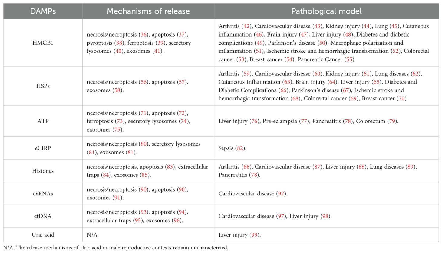 Building on the descriptions of the various types of DAMPs, their release mechanisms are diverse and complex, encompassing necrosis/necroptosis (26), apoptosis (27), pyroptosis (28), ferroptosis (29), extracellular traps (30), secretory lysosomes (7), and exosomes (31). Each of these mechanisms contributes to the release of DAMPs under different pathological and physiological conditions. For instance, necrosis and necroptosis typically result in the uncontrolled release of intracellular contents, including DAMPs, due to cell membrane rupture (32). In contrast, apoptosis generally involves a more controlled release of apoptotic bodies containing DAMPs (33). Pyroptosis and ferroptosis also contribute to DAMPs release through distinct forms of regulated cell death characterized by inflammatory responses and lipid peroxidation, respectively (34). Additionally, DAMPs can be actively secreted through extracellular traps formed by immune cells, as well as through secretory lysosomes and exosomes (35), which are specialized vesicles that facilitate intercellular communication (Figure 1). The specific release mechanisms and the tissue types involved in these processes are detailed in Table 1. These DAMP release pathways, though general in cellular biology, are also active in male reproductive tissues such as the testes and epididymis. The physiological consequences of these mechanisms—including their effects on sperm development, motility, and function—are discussed in detail in Section 4.