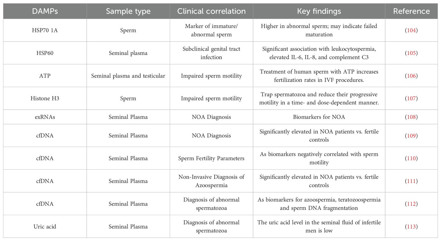 Inflammation, along with various forms of cellular stress and damage, can significantly impact male reproductive processes, including spermatogenesis (100), sperm maturation (101), and fertilization (102). The presence of these stressors in the male reproductive tract often leads to the release of DAMPs. DAMPs play crucial roles in spermatogenesis, sperm maturation, and fertilization. Research has demonstrated the involvement of various DAMPs in different regions of the male reproductive tract, impacting these critical processes (103). Clinically, the levels of specific DAMPs have been established as valuable biomarkers, reflecting distinct infertility phenotypes (Table 2).