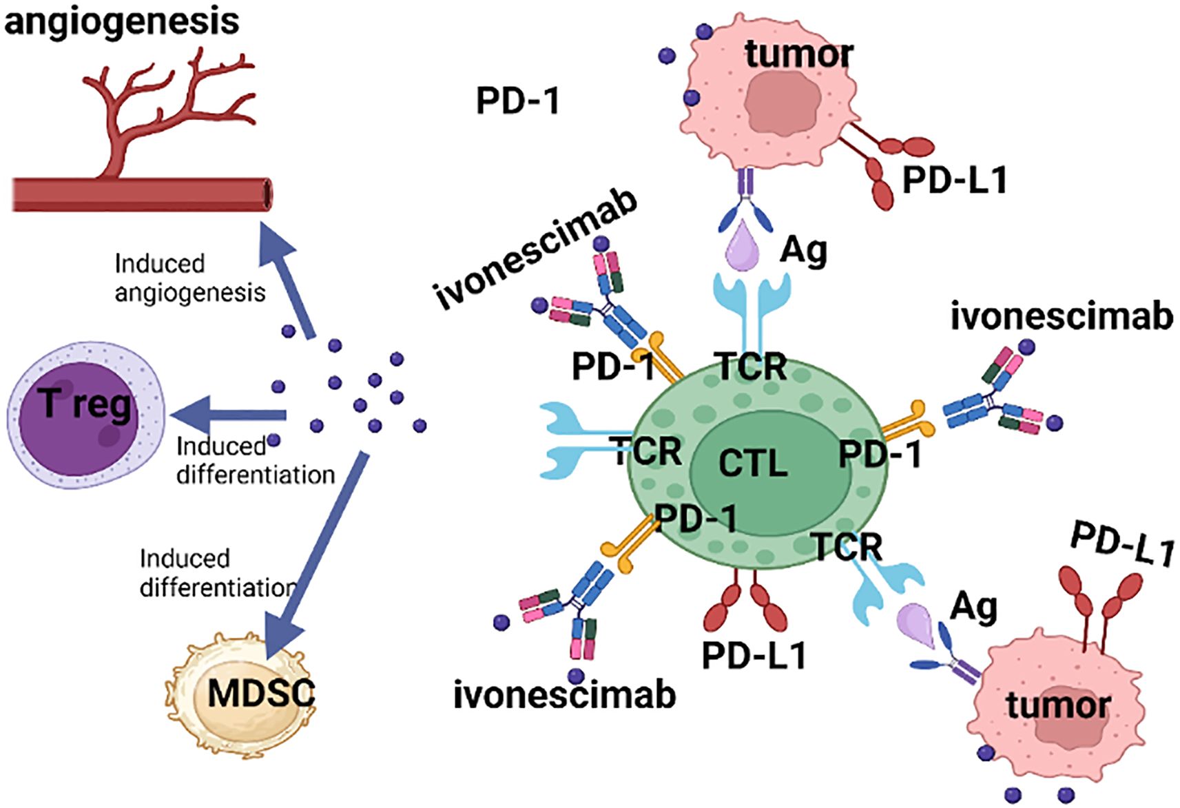 Bispecific antibodies (BsAbs) are a class of engineered proteins that resemble immunoglobulin (IgG) or antibody fragments (Fab), combining various antigen-binding sites into one structure. Their primary goal is to simultaneously block two targets involved in pathological processes, thereby enhancing therapeutic efficacy (11). BsAbs can be created by fusing a single-chain variable fragment (scFv) with the C-terminal Fc fragment of an IgG (i.e., IgG-scFv) (12). Ivonescimab is a pioneering, IgG1-scFv humanized, bispecific monoclonal antibody developed by Akeso Biopharma. It targets both PD-1 and VEGF and is in development for the treatment of non-small cell lung cancer (NSCLC) and other advanced solid tumors, such as breast, liver, and gastric cancer (Figure 1). The underlying mechanism of Ivonescimab is as follows (Figure 2): 1) In the presence of VEGF, the tetravalent structure of Ivonescimab facilitates the formation of a soluble complex with VEGF dimers. This complex formation accelerates the binding kinetics of Ivonescimab to PD-1, thereby potentiating its blockade of the PD-1/PD-L1 signaling axis and further alleviating PD-1/PD-L1 pathway-mediated immunosuppression, leading to the activation of cytotoxic T lymphocytes (CTLs) and an amplified T-cell response. Furthermore, the antigen-binding activity of Ivonescimab to PD-1 exhibits slower dissociation kinetics in the presence of VEGF, resulting in an 18-fold higher binding affinity compared to penpulimab (11).