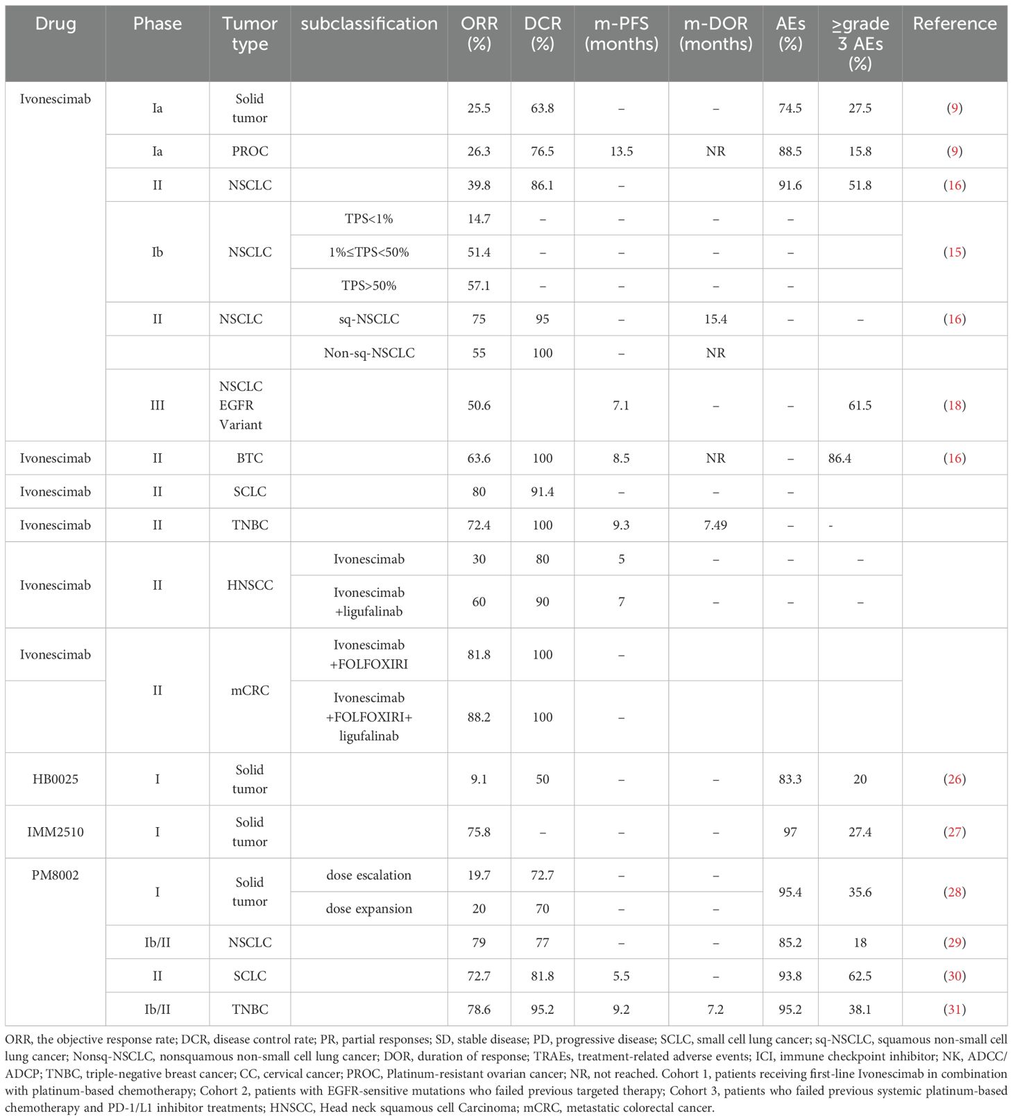 A multicenter, phase I, open-label dose escalation and expansion study (NCT04047290) (9) was conducted in advanced solid tumors that are resistant/refractory to standard therapies, patients received Ivonescimab (0.3 mg/kg to 30 mg/kg) administered IV every 2 weeks (Q2W) and using accelerated titration followed by 3 + 3 + 3 dose escalation design, and results demonstrated that the 47 participants who had at least one postbaseline assessment, the confirmed objective response rate (ORR) was 25.5% and disease control rate (DCR) was 63.8%. Furthermore, results showed that Ivonescimab achieved good antitumor activity and safety in patients with platinum-resistant/refractory epithelial ovarian cancer (PROC), with an ORR of 29.4% and a DCR of 76.5%. The median follow-up duration was 4.5 months, and the median duration of response (DOR) had not yet been reached. Among the four responders, one patient with endometrial cancer had no prior exposure to ICIs or bevacizumab, one patient with ovarian cancer and another with mesothelioma had previously received ICIs, and one patient with microsatellite stable colorectal cancer had undergone prior bevacizumab treatment. Notably, 68.4% of the patients had undergone three or more lines of prior therapy. PR was achieved in five patients, including three with high-grade serous pathology and two with clear cell pathology, resulting in an ORR of 26.3%. The 20 mg/kg dose group demonstrated a higher ORR compared to the 10 mg/kg group (30.0% vs. 14.3%). Additionally, four patients who had previously received bevacizumab experienced stable disease (SD) lasting over 12 months. Promising efficacy signals were also observed in patients with mismatch repair proficient colorectal cancer, non-small cell lung cancer (NSCLC), and both mismatch repair deficient and proficient endometrial cancer. These findings suggest that ivonescimab is well-tolerated at doses up to 20 mg/kg every two weeks (Q2W), with doses of 3 mg/kg Q2W or higher demonstrating significant antitumor activity, achieving an ORR of 23.5% in patients with advanced solid tumors resistant to or relapsed after standard therapies (9).