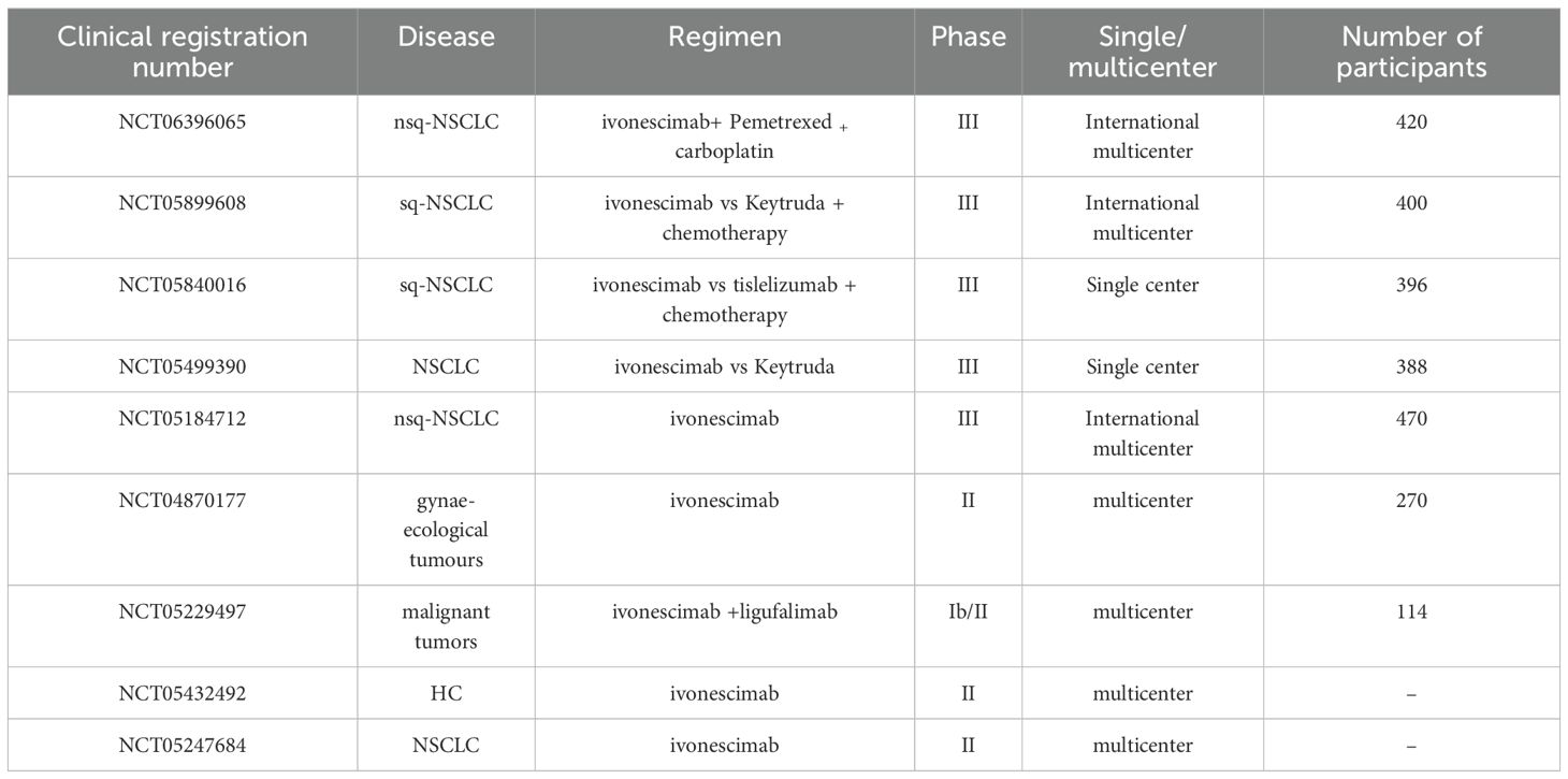 A phase II, open-label, multicenter clinical trial (NCT04736823) (16) was conducted to assess the safety and efficacy of AK112 combined with chemotherapy in patients with metastatic non-small cell lung cancer (NSCLC). Participants were divided into three cohorts based on their clinical characteristics. Cohort 1 included treatment-naïve patients with advanced NSCLC lacking EGFR or ALK gene alterations. These patients received Ivonescimab alongside pemetrexed (500 mg/m²) for non-squamous (non-sq) NSCLC or paclitaxel (175 mg/m²) for squamous (sq) NSCLC, combined with carboplatin (AUC 5 mg/mL/min) for four cycles. Maintenance therapy involved continued Ivonescimab with pemetrexed for non-sq NSCLC or Ivonescimab monotherapy for sq NSCLC. Cohort 2 comprised patients with EGFR-sensitive mutations who had progressed after EGFR-TKI therapy. They were treated with pemetrexed, Ivonescimab, and carboplatin for four cycles, followed by pemetrexed plus Ivonescimab as maintenance. Cohort 3 included patients with advanced NSCLC who had failed platinum-based chemotherapy and anti-PD-1/PD-L1 therapies, receiving Ivonescimab combined with docetaxel (75 mg/m²). Two Ivonescimab doses (10 or 20 mg/kg) were tested across cohorts, yielding confirmed ORRs of 53.5%, 68.4%, and 40.0% in cohorts 1, 2, and 3, respectively. Additionally, in cohort 1, the median progression-free survival (m-PFS) was not reached, with a 12-month PFS rate of 59.1%. For cohorts 2 and 3, the m-PFS was 8.5 months (95% CI, 5.5–not estimable [NE]) and 7.5 months (95% CI, 2.3–NE), respectively, with corresponding 12-month PFS rates of 35.5% and 44.5%. In summary, among 135 patients with advanced or metastatic NSCLC treated with Ivonescimab plus chemotherapy, 63 had small cell lung cancer (SCLC) and 72 had non-small cell lung cancer (non-SCLC). SCLC patients achieved an ORR of 75%, a median duration of response (DOR) of 15.4 months, a disease control rate (DCR) of 95%, and 9-month PFS and overall survival (OS) rates of 67% and 93%, respectively. Meanwhile, NSCLC patients demonstrated an ORR of 55%, a DCR of 100%, and 9-month PFS and OS rates of 61% and 81%, respectively, though the DOR was not reported.