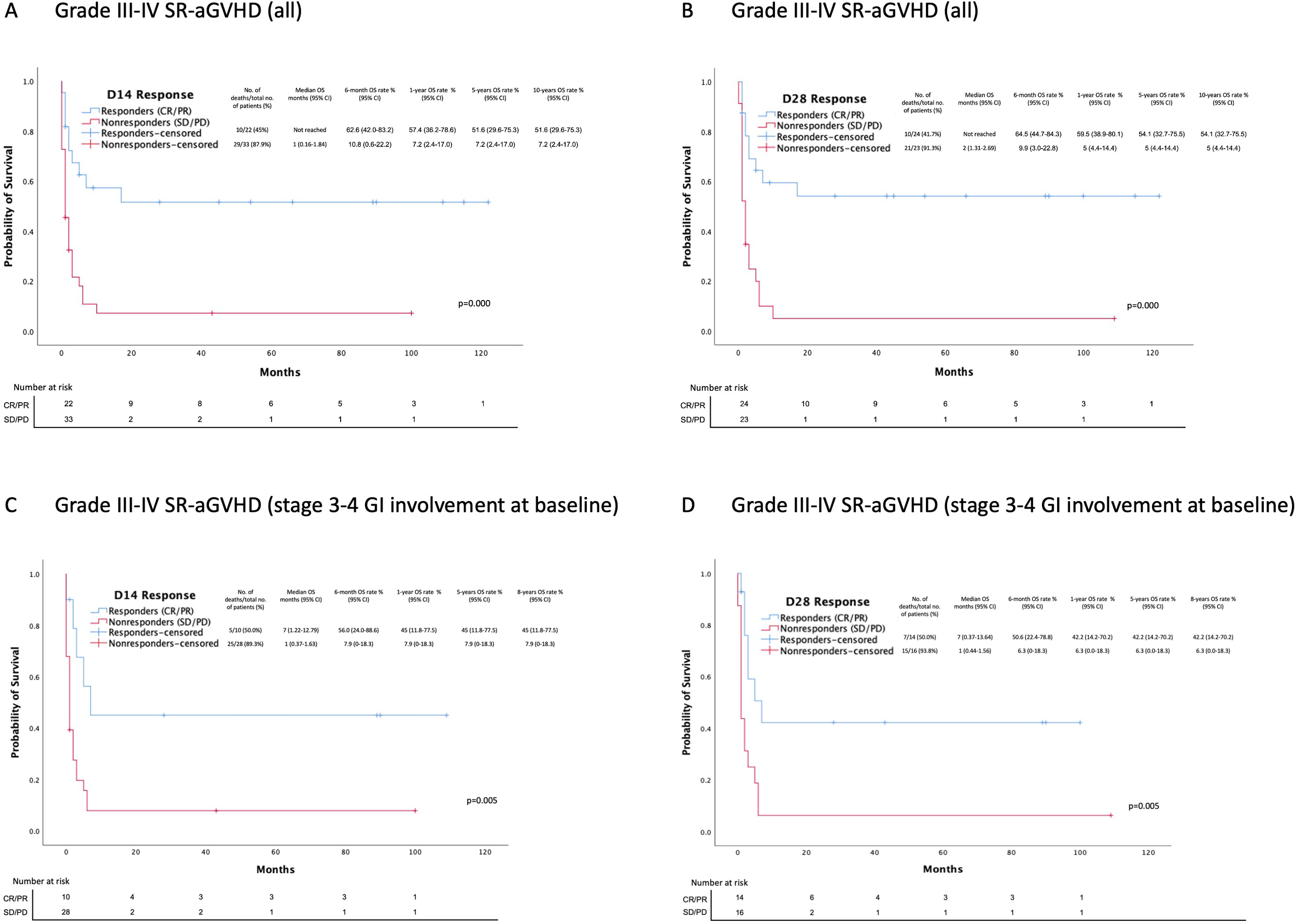 Fifty-seven adult patients with biopsy-proven III-IV grade SR-aGVHD (93% with GI involvement) received MSC treatment. The overall response rate (ORR) was 39% and 42% on Days 14 and 28, respectively, with no significant differences between the two MSC groups (Day 28 ORR 38% for MSC3 and 44% for MSC6). In patients with stage 3-4 GI involvement, the ORR was 26% and 36% at the corresponding time points with comparable efficacy between the two MSC groups (Day 28 ORR 31% for MSC3 and 38% for MSC6). Day 14 and Day 28 responders had significantly higher OS compared to non-responders (52% vs. 7%, p=0.000; 54% vs. 5%, p=0.000), with a comparable OS benefit observed in patients with stage 3-4 GI involvement (45% vs. 8%, p=0.005; 42% vs. 6%, p=0.005), respectively. MSC treatment had a favorable safety profile. The one, 5 and 10-year OS rates were 27%, 24%, and 24%, respectively.
