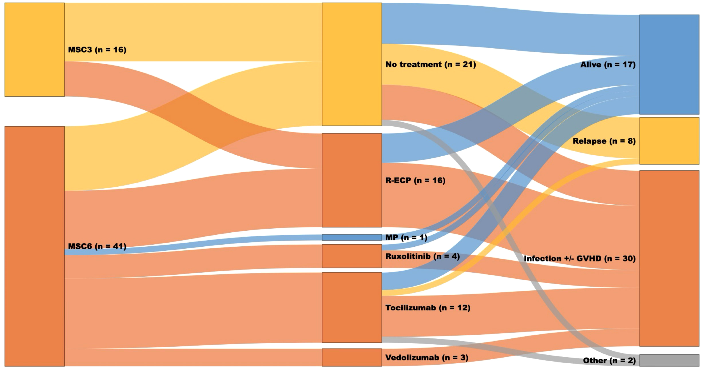 The study, consisting of two MSC groups, began in October 2013, and the last patient was included in November 2023. The MSC3 and MSC6 groups enrolled patients from October 2013 to December 2015 and from December 2015 to November 2023, respectively. In the MSC3 group, all patients were scheduled to receive two once-weekly MSC doses administered by rapid intravenous infusion. The 3rd dose was reserved for patients who failed to achieve complete response (CR) following two infusions. Following interim analysis of the MSC3 results that demonstrated aGVHD flare-ups after the initial response, the treatment schedule was amended, and patients received six MSC doses administered once weekly by rapid intravenous infusion, regardless of response (MSC6 schedule). The intended weekly MSC dose in both groups was 1 × 106/kg body weight.