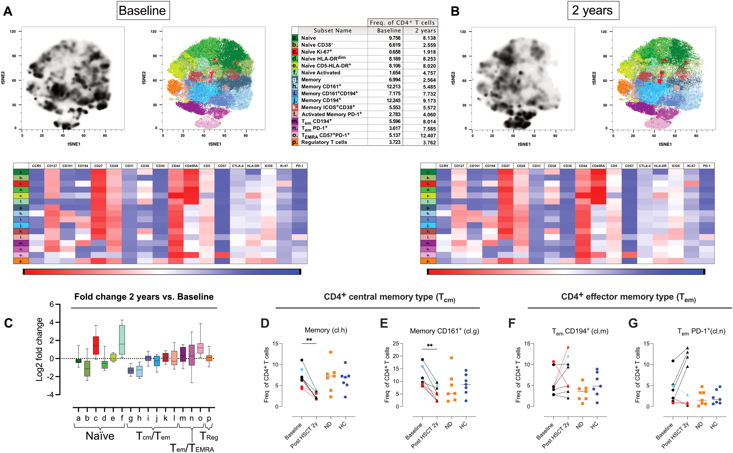Shifts in naïve, central memory, and effector CD4 T cell phenotypes after AHSCT. Analysis of mass cytometric data (CyTOF, panel 2) of the CD4 T cell population (CD45+CD3+CD4+CD8- CD19-CD20-CD14-) in PBMCs from MS patients at baseline (n=8) and two years post-AHSCT (n=8). The CyTOF data were concatenated, CD4 T cells were manually gated and subjected to high-dimensional reduction analysis of the CD4 T cell population using t-SNE, followed by Phenograph clustering and heatmap analysis of marker expression within distinct cell clusters, visualized using Cluster Explorer. The distribution of CD4 T cell clusters is shown at baseline (A) and two years post-AHSCT (B), along with a table summarizing the mean relative frequencies of each cluster at both time points. The heatmaps show mean expression levels of cellular markers in each cell cluster. The summary graph (C) depicting log2 fold changes in the frequencies of phenotypically distinct CD4 T cell clusters at two years post-AHSCT compared to baseline across all patients. Dispersion measures are represented by the median, along with the minimum and maximum log2 fold change values. Relative frequencies of central memory (Tcm) CD4 T cells expressing no additional markers included in the panel (cluster h) (D) and CD4 Tcm T cells expressing CD161 (cluster g) (E). Effector memory T cells (Tem), which have lost CD27 expression, CD194+/CCR4+ (cluster m) (F), and Tem enriched for PD-1+ cells (cluster n) (G). Patients with a relapse post-AHSCT are highlighted in red, while one patient with a new T2 lesion post-AHSCT is marked in turquoise. Statistical analyses were performed with the Wilcoxon matched-pair test (**p<0.01).