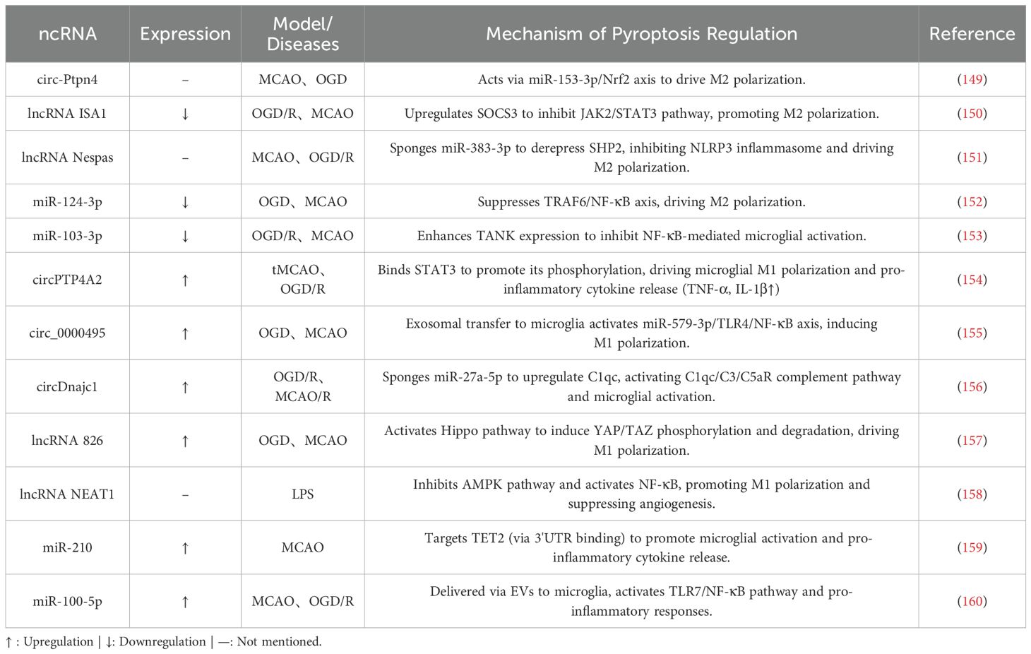 Recent advances in understanding the role of pyroptosis in stroke pathophysiology have shown that ncRNAs regulate pyroptosis signaling pathways at multiple levels by targeting critical components such as NLRP3 inflammasome activation and Caspase-1 processing (Table 3). This complex epigenetic regulation provides new insights into disrupting the vicious cycle of pyroptosis, neuroinflammation, and tissue.