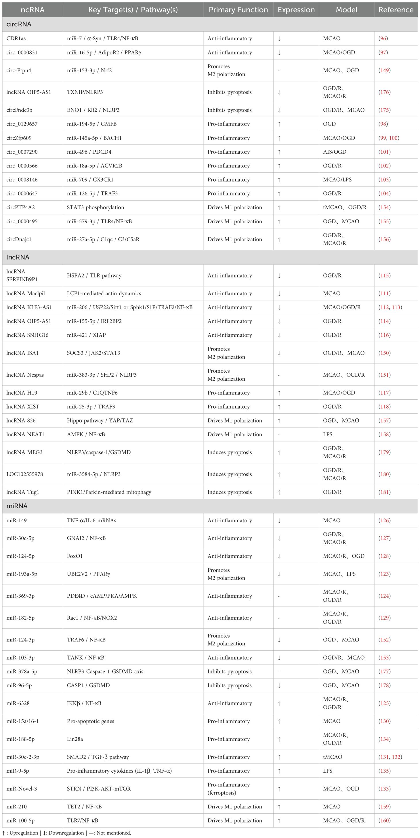 In stroke, excessive DAMP stimulation skews the M1/M2 balance toward the pro-inflammatory M1 phenotype. Encouraging M2 polarization can mitigate inflammation and enhance tissue repair, improving post-stroke outcomes (53, 148). Consequently, modulating microglial polarization—particularly toward the M2 state—represents a key strategy for reducing I/R injury. Among these approaches, ncRNA-mediated regulation stands out for its precision and capacity to target multiple pathways simultaneously (Table 2).