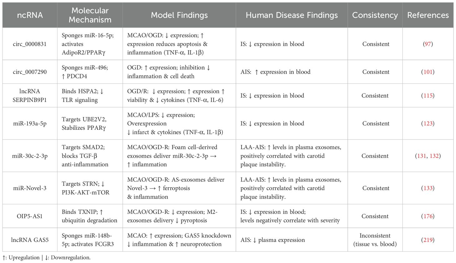 ncRNAs represent a class of regulatory RNA molecules lacking protein-coding potential, primarily comprising microRNAs (miRNAs), long non-coding RNAs (lncRNAs), and circular RNAs (circRNAs) (31). Accumulating evidence demonstrates that ncRNAs directly or indirectly participate in diverse pathophysiological processes of IS, critically regulating apoptosis, vascular remodeling, inflammatory cascades, and hypoxic stress responses (32–36). The interactions among ncRNAs reveal sophisticated molecular crosstalk. Specifically, circRNAs and lncRNAs function as molecular sponges to sequester miRNAs, thereby attenuating miRNA-mRNA binding capacity and reversing miRNA-mediated negative regulation of target mRNAs. This post-transcriptional regulatory paradigm, termed the competing endogenous RNA (ceRNA) mechanism, establishes multi-layered gene expression control networks (37–39). For instance, the circRNA-miRNA-mRNA axis orchestrates fundamental cellular processes such as immune homeostasis maintenance, cell cycle progression, and stress adaptation through miRNA activity modulation (40, 41). Such networked regulatory mechanisms open new avenues for deciphering the molecular pathogenesis of IS and developing precision-targeted therapeutic strategies.