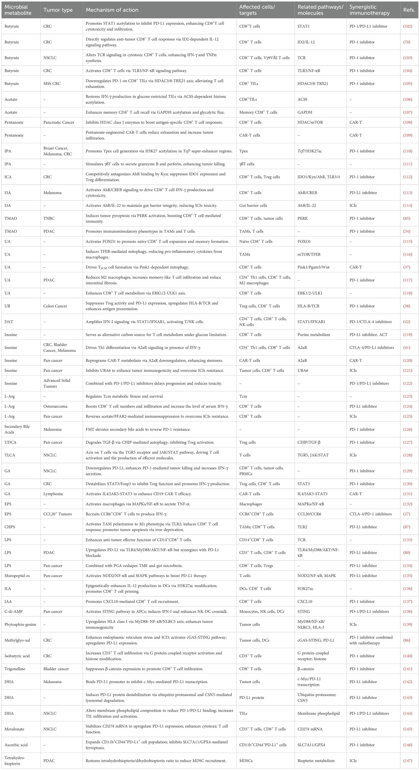 Beyond major classes, diverse microbial metabolites modulate tumor immunity through specialized mechanisms. Trimethylamine N-oxide (TMAO), derived from dietary choline metabolism, enhances CD8+ T cell cytotoxicity via protein kinase R-like endoplasmic reticulum kinase (PERK)-dependent pyroptosis, despite promoting metastasis in other contexts (31–35). Urolithins, produced from ellagic acid, induce mitophagy in tumor-associated macrophages (TAMs) via transcription factor EB (TFEB) activation while expanding CD8+ T memory stem cells through Pink1-mediated mitochondrial regulation (36–38). Inosine modulates adenosine A2a receptor signaling to enhance CD8+ T cell function in glucose-deprived TMEs, serving as an alternative energy source through ribose phosphorylation (39–41). Desaminotyrosine (DAT) amplifies type I interferon (IFN-I) signaling via signal transducer and activator of transcription (STAT)1-mediated interferon alpha/beta receptor 1 (IFNAR1) upregulation, enhancing T cell priming (42). L-arginine (L-Arg) fuels nitric oxide (NO) production and T cell polyamine biosynthesis, counteracting myeloid-derived suppressor cell (MDSC)-mediated immunosuppression in acetate-enriched TMEs (43–45). These metabolites highlight the expanding landscape of microbial mediators that fine-tune immune responses through metabolic-immune crosstalk.