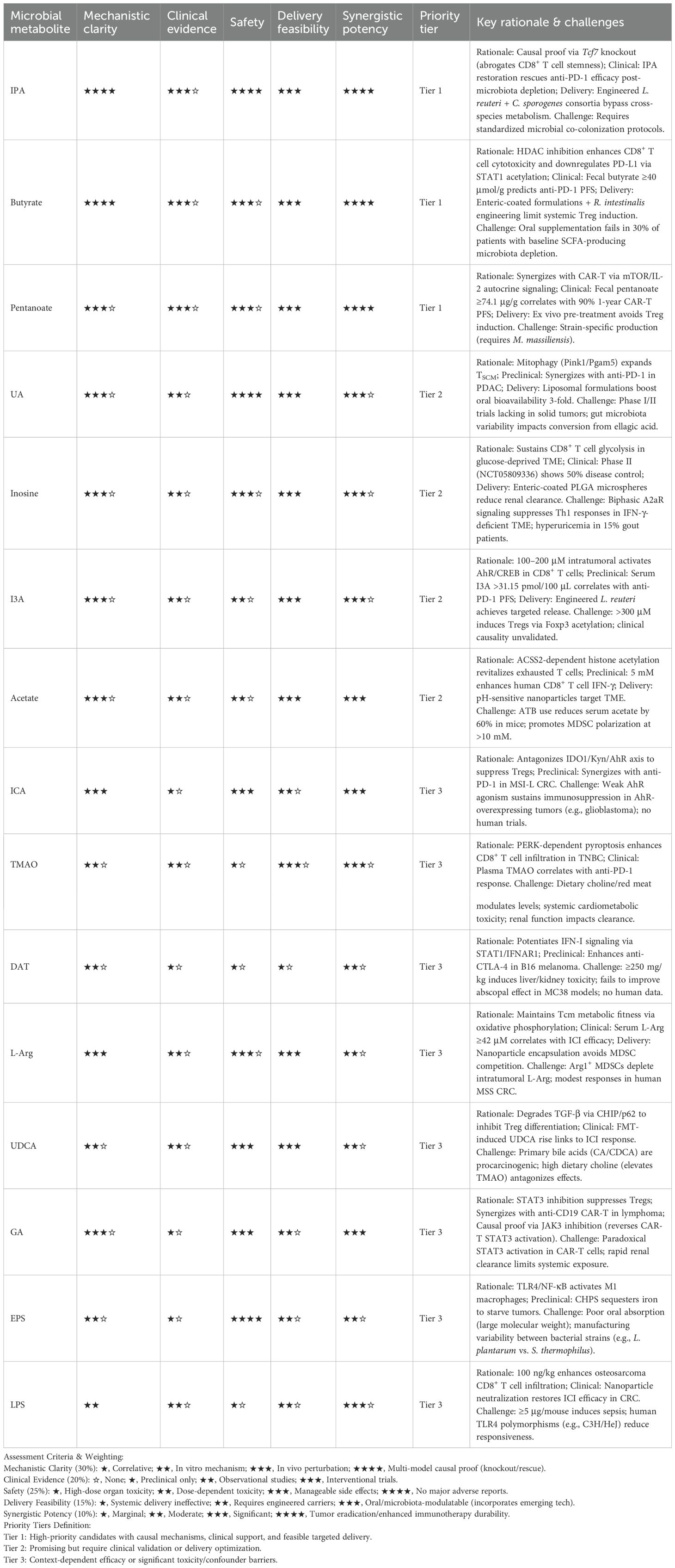 IPA represents the best-characterized indole metabolite due to robust causal evidence. While exhibiting basal roles in glycemic/lipid regulation and gut barrier preservation (157), its bioavailability is dynamically governed by dietary Trp, microbiota composition, and host metabolism (158)—with causal validation showing that IPA cannot be produced by Lactobacillus johnsonii alone (which only generates indole-3-lactic acid [ILA]) but requires cooperation with Clostridium sporogenes to metabolize ILA into IPA (110). This microbial synergy is indispensable: germ-free mice colonized with both strains, but not either alone, exhibit elevated plasma IPA and enhanced aPD-1 efficacy (110). Mechanistically, causal evidence from gain- and loss-of-function studies demonstrates IPA epigenetically sustains CD8+ T cell stemness via H3K27 hyperacetylation at the Tcf7 super-enhancer region (110). This reprogramming drives progenitor-exhausted T cell (Tpex) differentiation, as shown by: (1) IPA supplementation in breast cancer, melanoma, and CRC models synergizing with PD-1 blockade to increase CD8+ tumor-infiltrating lymphocyte (TIL) frequency and T-cell factor 1 (TCF-1) expression; (2) Tcf7 knockout abrogating IPA’s ability to enhance immunotherapy, confirming Tcf7 as a critical mediator; (3) adoptive transfer of IPA-pretreated CD8+ T cells (but not untreated cells) restoring aPD-1 responsiveness in Rag1-/- mice, with CD8 neutralization eliminating IPA’s efficacy (110). Pan-cancer studies further validate IPA’s causal role: its supplementation improves ICI response rates across malignancies (110, 159), while ATB-induced microbiota depletion reduces IPA levels and blunts γδ T cell-mediated tumor control—an effect reversed by exogenous IPA, which directly upregulates granzyme B/perforin in γδ T cells (111). Collectively, these experiments establish IPA as a microbial metabolite with causal roles in enhancing immunotherapy, warranting therapeutic prioritization. The requirement for microbial consortia highlights a major translational hurdle: bacterial teamwork is often essential for generating the most beneficial metabolites, complicating simple probiotic approaches.
