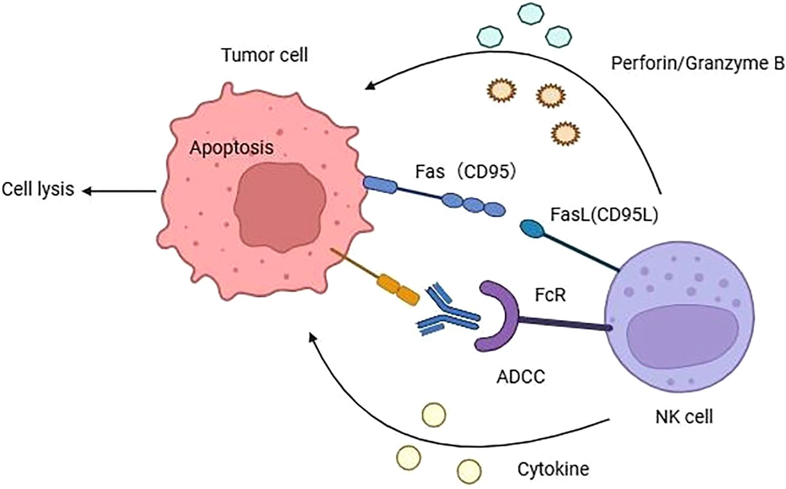 The mechanisms of NK cells mediated cytotoxicity are diverse and can be summarized as follows (Figure 1): (1) The perforin/Granzyme B Pathway: NK cells release granzyme B and perforin, which directly form transmembrane channels on the target cell membrane, enhancing membrane permeability and causing target cell lysis. This pathway is crucial for eliminating mutant tumor cells (29). (2) The death ligand pathway: NK cells typically express three distinct death ligands: Fas ligand (FasL), TNF ligand, and TNF-associated apoptosis-inducing ligand (TRAIL), which induce apoptosis by binding to their corresponding death receptors on the surface of tumor cells (30). (3) The cytokine pathway: NK cells secrete various cytokines, including IFN-γ, TNF-α, and IL-2, among others (31). IFN-γ inhibits the proliferation of tumor cells, blocks tumor angiogenesis, and overexpresses MHC molecules in cells, further stimulating antigen presentation. TNF-α activates the nucleic acid-degrading endonuclease in target cells, leading to DNA degradation and the induction of programmed cell death. IL-2, on the other hand, stimulates NK cell proliferation and enhances their killing activity. (4) The antibody-dependent cell-mediated cytotoxicity (ADCC) pathway: CD16, expressed by NK cells, binds to the IgG Fc segment of target cells, inducing activation through signaling and subsequent cell death (32). The administration of IL-2 and IFN-γ markedly augments the ADCC effect of NK cells by inducing Fas expression, which in turn activates the death ligand mechanism and induces apoptosis.