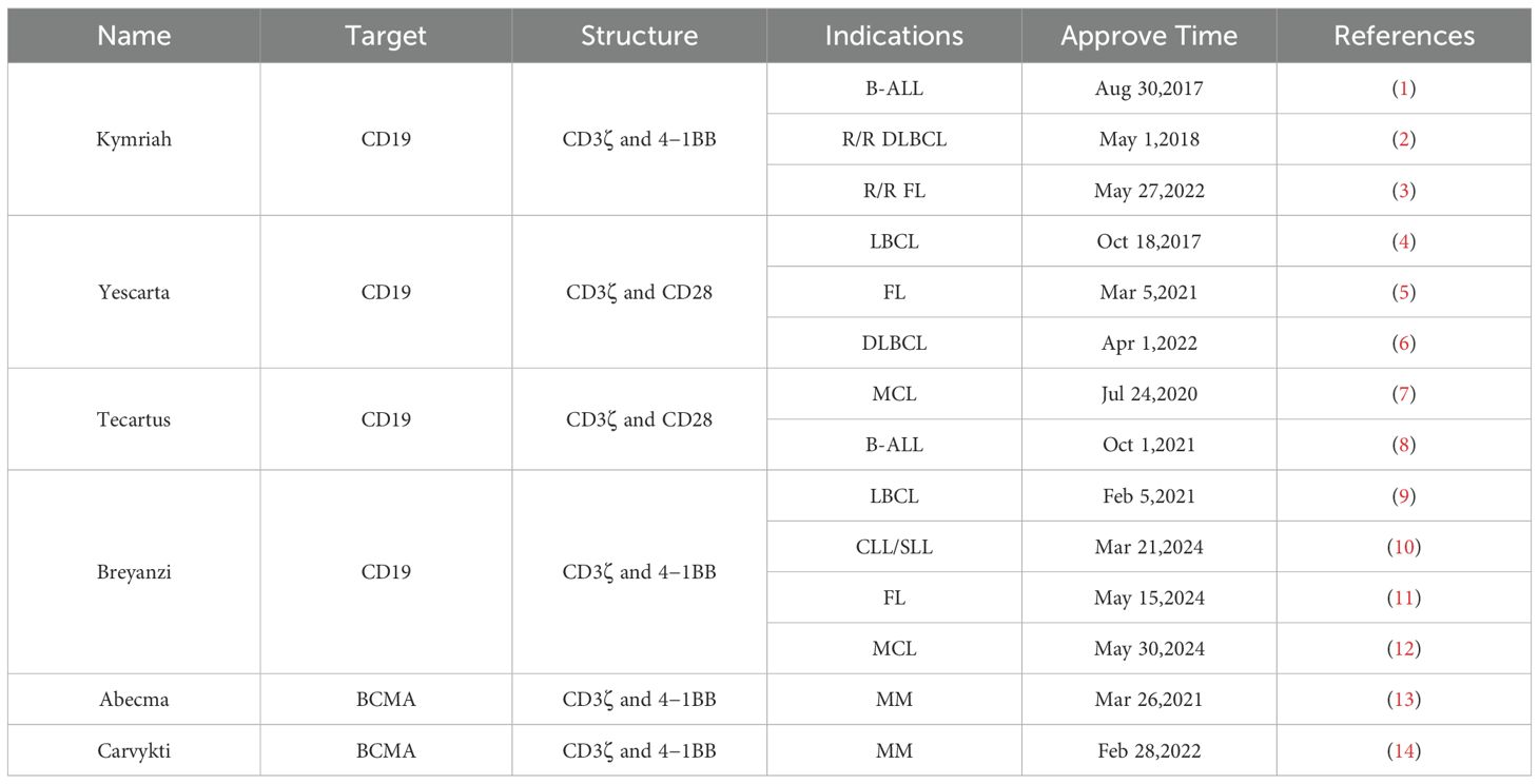 Cellular immunotherapy, an innovative approach in oncology often referred to as adoptive cell therapy, has become a major focus in tumor treatment. The expression of chimeric antigen receptors (CARs) on immune cells has revolutionized immunotherapy by enabling the redirection of a patient’s immune cells against malignancies. Global research efforts in CAR T-cell therapies have resulted in more than 1,000 clinical trials to date. Since 2017, the U.S. Food and Drug Administration (FDA) has approved six CAR T-cell products for hematologic malignancies (Table 1). Despite these advances, CAR T-cell immunotherapies confront several limitations: intricate manufacturing processes, insufficient tumor-specific antigen targets, and suboptimal cellular trafficking and tumor penetration. Furthermore, post-treatment complications including antigen escape and treatment-related toxicities may worsen disease progression and sustain therapeutic shortcomings.