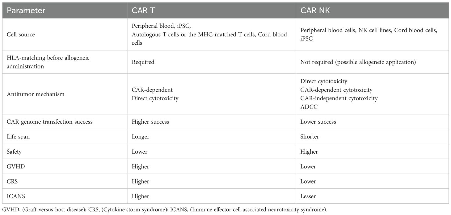 The success of CAR T-cell therapy in clinical trials has prompted extensive research into CAR NK cells development. Due to their lower risk of side effects and enhanced tumor cytotoxicity, CAR NK cells represent a promising alternative to CAR T-cell therapy. Below we present a comparative analysis of CAR T and CAR NK cells therapies (Table 2).