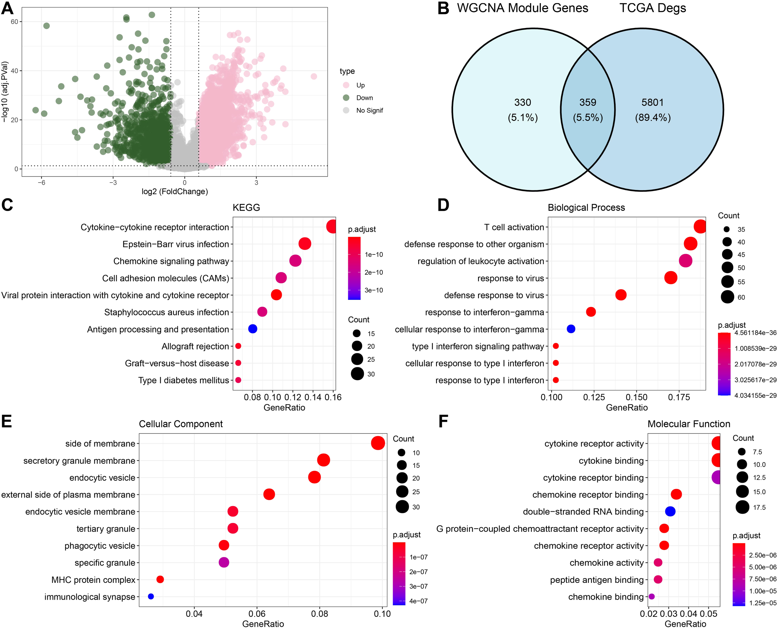 Figure 2. Functional enrichment analysis of DEGs with modular gene intersection genes. (A) Volcano map displaying the DEGs of tumor and normal group based on TCGA cohort. (B) The intersection of differential genes and midnightblue and green module genes. (C-F) Results of enrichment analysis of intersecting gene pathways.