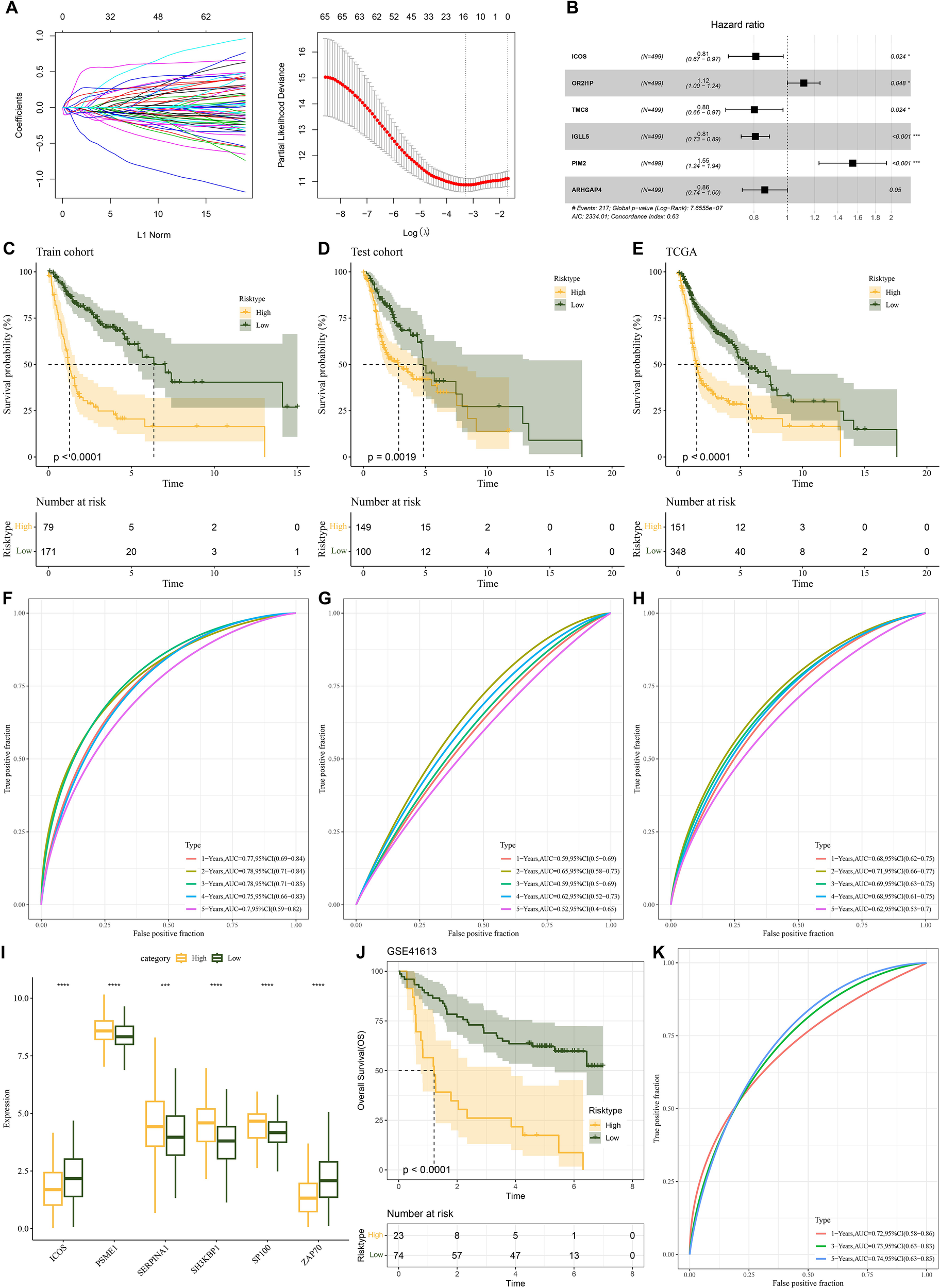 Figure 3. Establishment of a prognosis model for HNSCC patients and validation. (A) A number of LASSO Cox shrinkage genes. (B) Multifactorial random forest plot. (C) KM survival curves was plotted for the TCGA training data cohort. (D) KM survival curves was plotted for the TCGA validation cohort. (E) KM survival curves was plotted for the TCGA cohort. (F) ROC curves for Riskscore in the TCGA training data cohort. (G) ROC curve for Riskscore in the TCGA validation data cohort. (H) ROC curve of Riskscore in TCGA cohort. (I) The expressions of the prognosis genes in the TCGA cohort. (J) KM survival curves of Riskscore in the GSE41613 cohort. (K) ROC curve of Riskscore in the GSE41613 cohort. ns, p > 0.05, not statistically significant; *p < 0.05; ***p < 0.001; ****p < 0.0001.