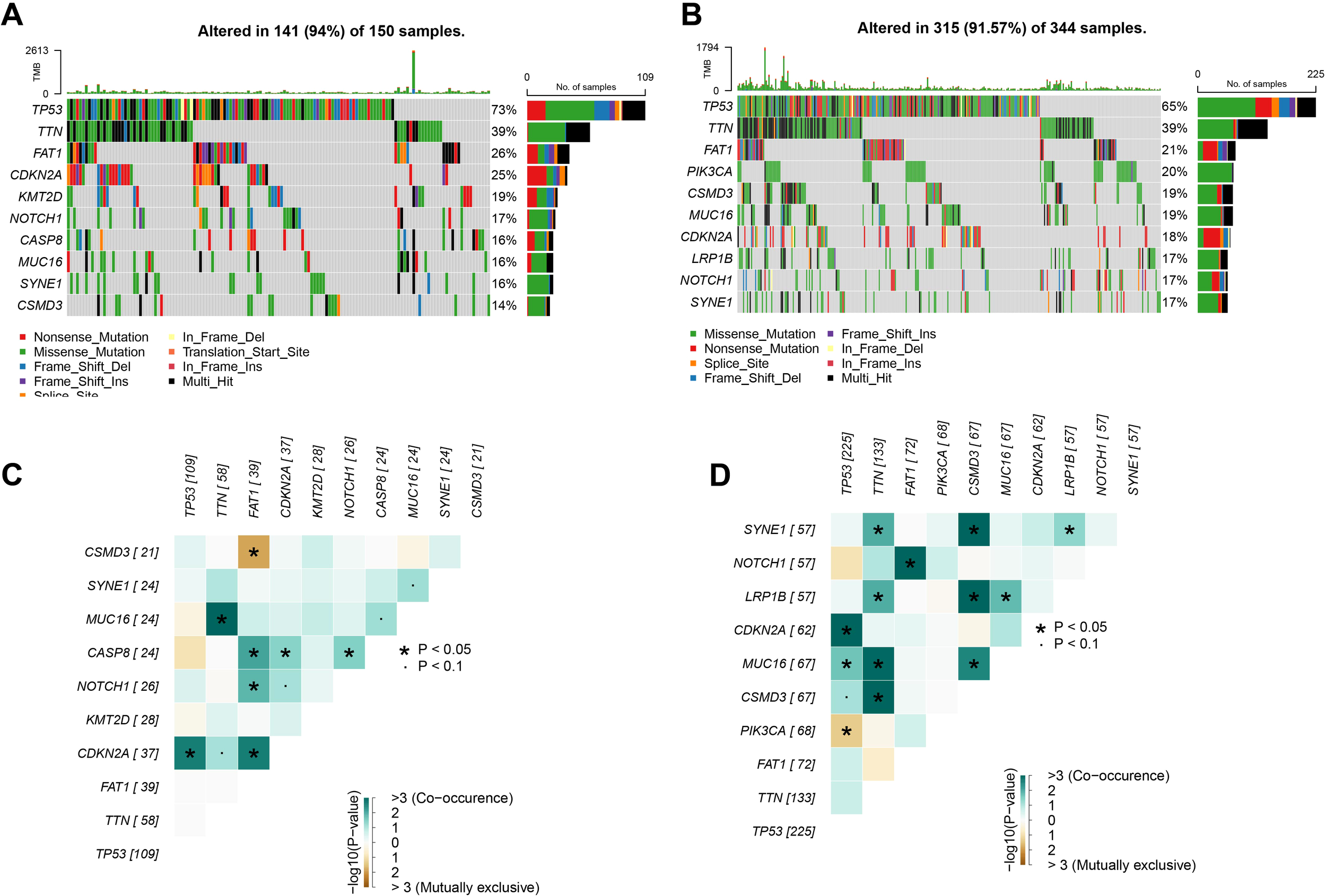 Figure 4. Landscape of gene mutations in HNSCC. (A) TCGA cohort high-risk group high frequency mutations top 10 genes. (B) TCGA cohort low-risk group high-frequency mutation top 10 genes. (C) Interactions of high-frequency mutation top 10 genes in the high-risk group of the TCGA cohort. (D) Interactions of high-frequency mutation top 10 genes in the low-risk group of the TCGA cohort. ns, p > 0.05, not statistically significant; *p < 0.05.