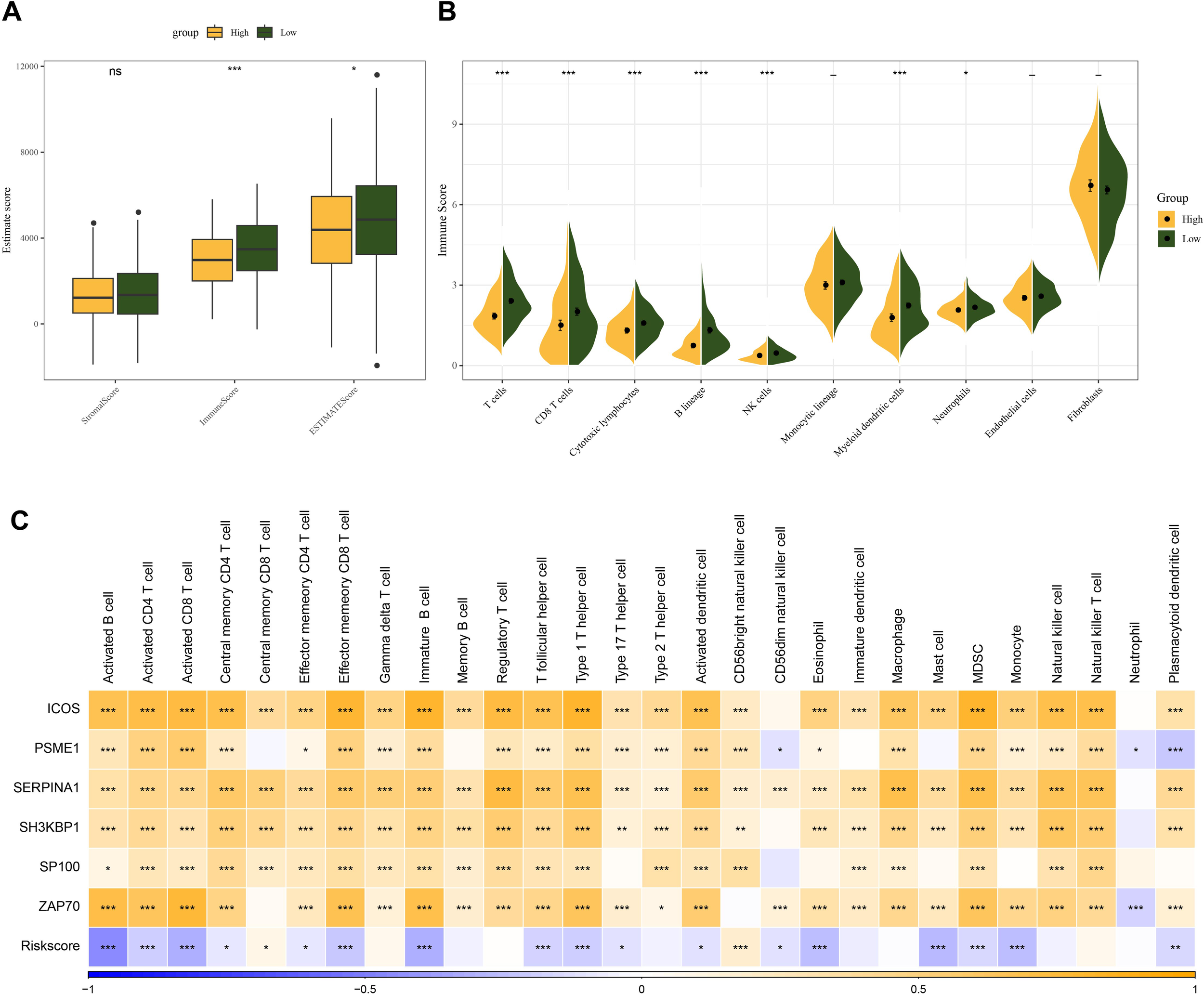 Figure 5. Relationship between Riskscore and HNSCC immune microenvironment. (A) ESTIMATE scores between high and low-risk groups in the TCGA cohort. (B) MCPcounter assessment of 10 immune cell scores in Riskscore groupings. (C) Correlation of immune infiltration scores assessed by ssGSEA with Riskscore and prognostic genes. ns, p > 0.05, not statistically significant; *p < 0.05; **p < 0.01; ***p < 0.001.